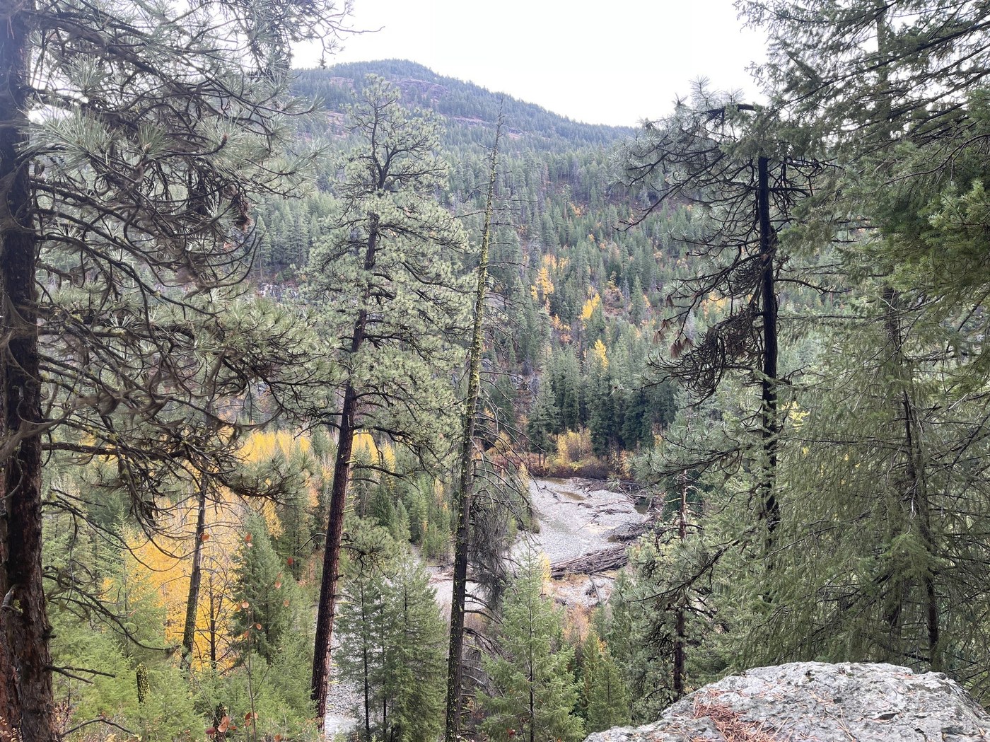 The gentle trail travels above Lost River through some beautiful old growth Ponderosa Pines. Although Autumn colors are well off their peak, we still found the river visas colorful. The river was flowing well. Blue skies and short shirt sleeve weather made for a great day hike.