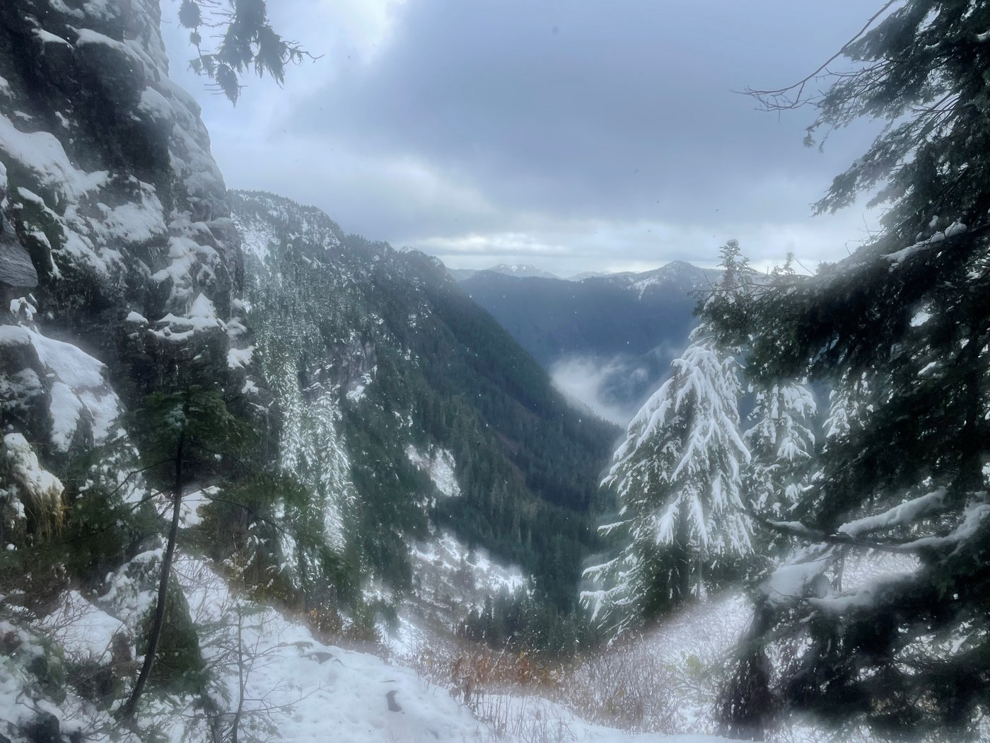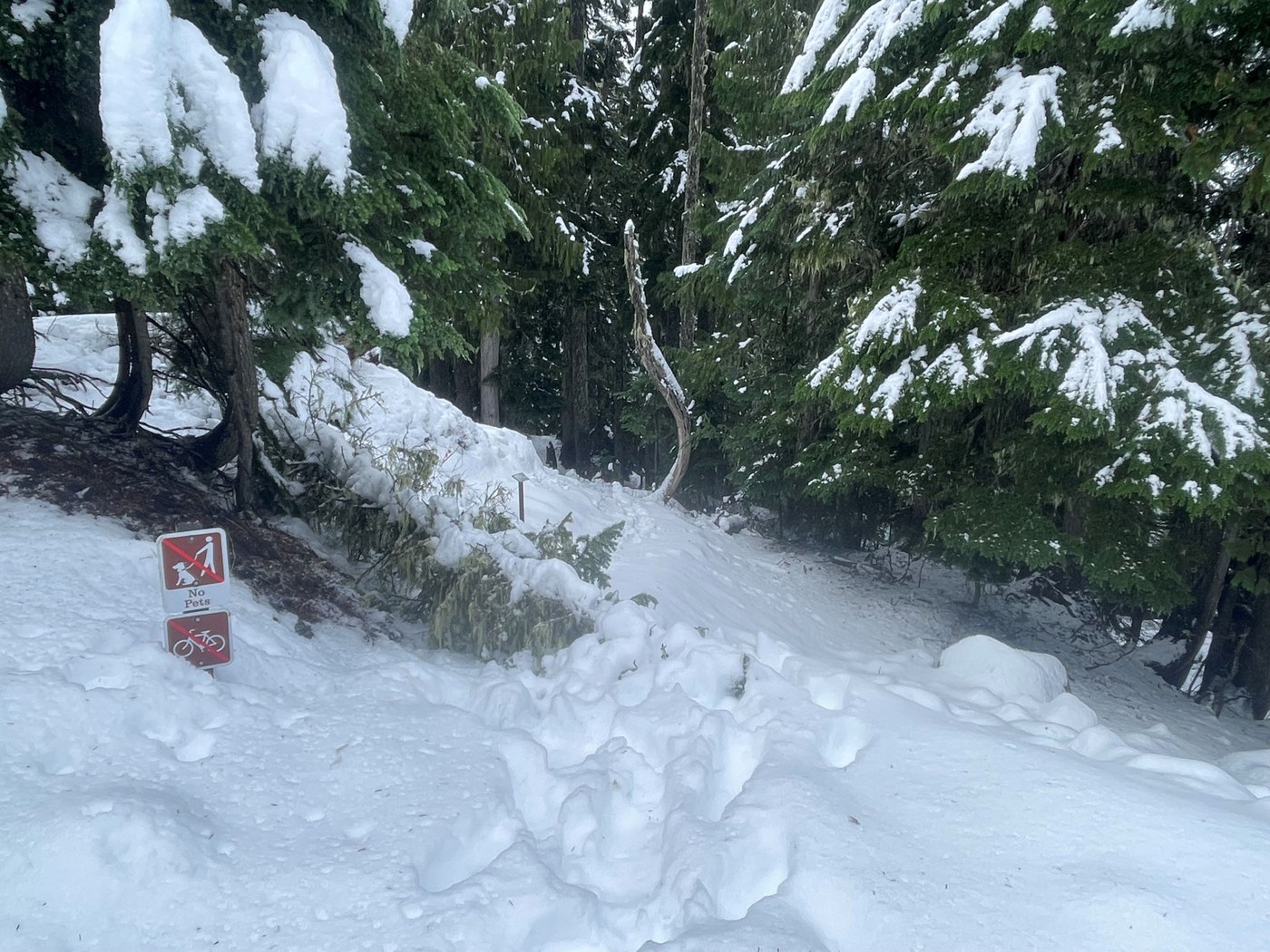 The grindstone trail is neat and truncates two big loops in the road, but today it was 100% snowed in 4-8" deep, with plenty of muddy spots too. The trail is pretty well packed down and easy to follow. May not be as the snow gets deeper, not sure. Back on the road after a mile or so it was a short way to the Tolmie Peak TH, which I walked just two months before. I was hoping to make it to Tolmie Lookout, but the weather stunk and there were no chances of views. With the wind kicking up and knocking giant clumps of snow out of the trees all around me (WHOOMPH! BOOM!), I turned around at the top of the pass at 4.8 miles and 2:08 into the hike. Easier and uneventful back to the car by 3 hours and 45 minutes or so, or a little before noon. Completely drenched, but it was a nice hike in the snow. No traction needed since it was slushy/crunchy, but I used my poles (as always). Vertical gain about 1,800 feet--so weird to not gain that much height, yet there was 10" of snow at the top and zero snow at the car (but plenty of rain).