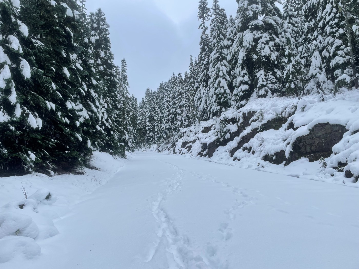 The first five miles of the unpaved road were okay--I set my cruise control to 30 and the Outback behaved until the potholes made me rethink my life choices. Parked near the toilets at the gate (stinky, but oodles of TP!), and started hiking at 8:00 am. The road was bare at first, then some small snow patches after one mile, a thin layer of snow at about two miles, and a good 2-3 inches by the time I turned off for the Grindstone Trail (which saves you about a mile in each direction--plus it's a nice hike!). Also, saw a good-sized black bear on the road--maybe 50 feet away and he seemed more surprised than I was. I clacked my poles a few times and scolded him loudly for being in the way so he obliged by heading off trail. Shouldn't he be asleep?