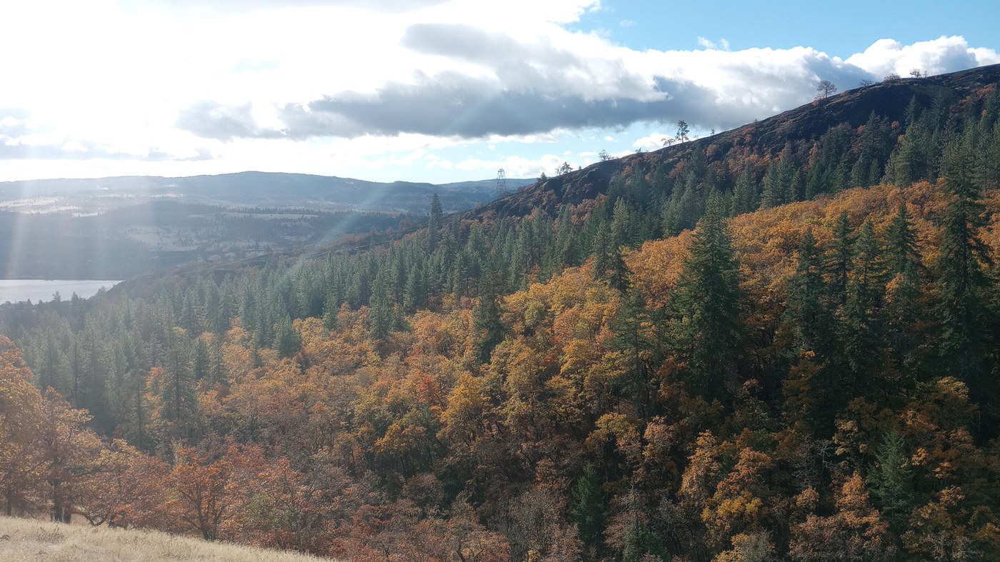 This is big sky country. Just a few miles west and hikes are forested and the sky just peeks thru. Here, forests give way to oak groves and wide open grassland. In Spring is full of flowers and green. Now, flowers give way to burnished oak leaves from deep green to scarlet, with blue sky and the Columbia rolling on below. Its windy and crisp, and the trail is rocky enough that you have to watch where you step.