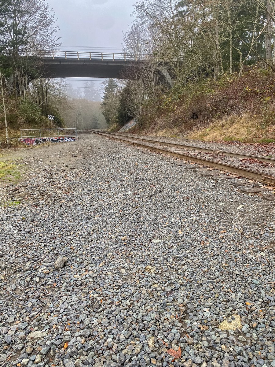 We arrived around 8:35 to find 3 other cars in the foggy parking lot. There is a porta-potty at the south parking lot near the Mukilteo community garden. We headed along the flat gravel trail until we met two women and their off-leash dogs, and then we had the trail to ourselves. There are some cool trees (photo - nurse trunk) not too far from the parking lot. The fog lent a mysterious air to the woods. My dog loved it.