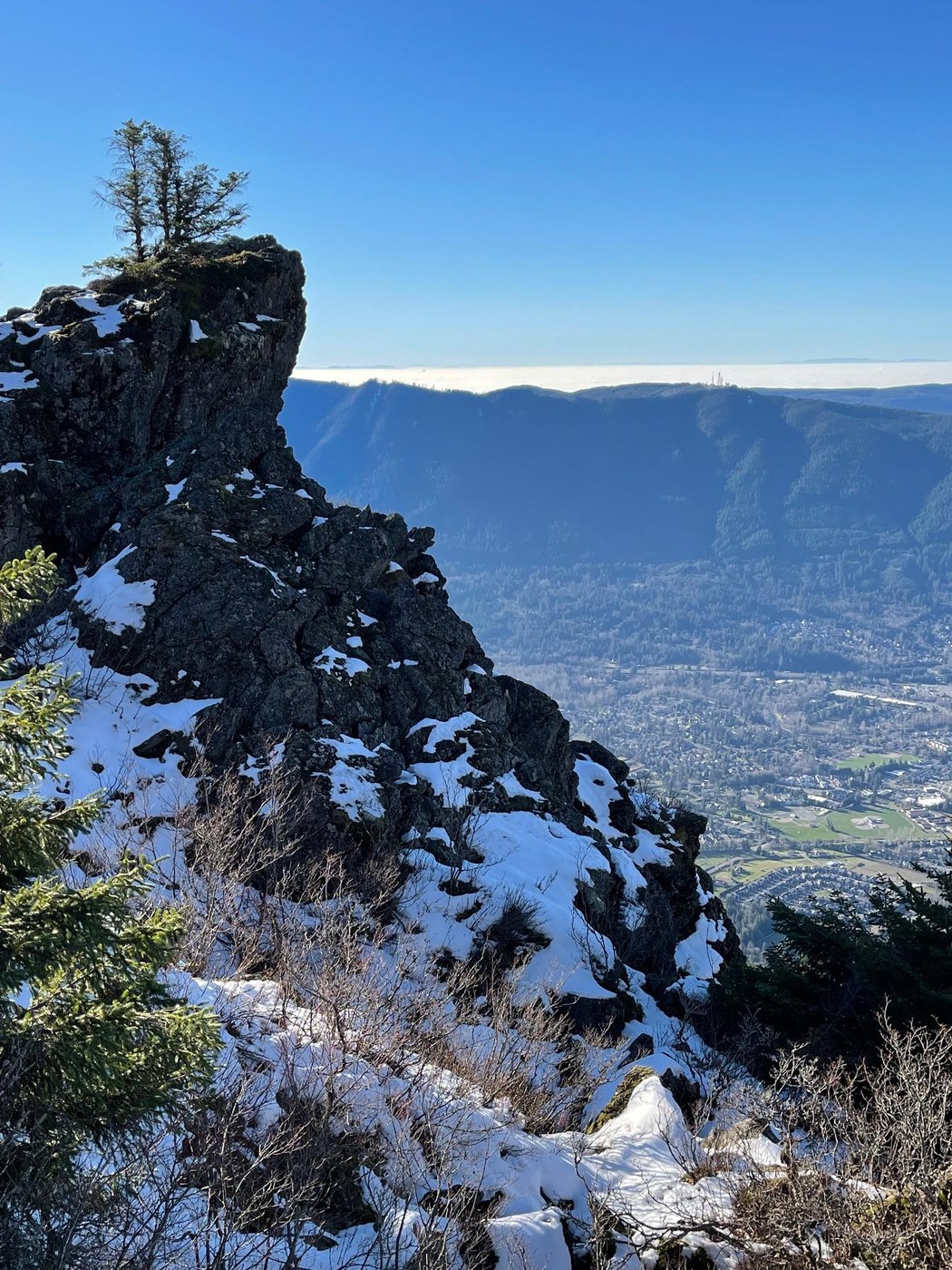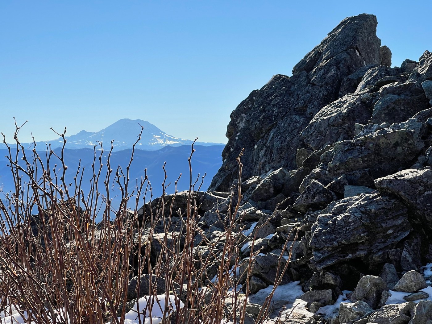 Snow starts in the boulder field and is compact & slick in places, but we never bothered to put our microspikes on. There was either a rock popping through the ice or dirt on the snow that gave enough traction to get out to the viewpoint with minimal effort. However, if you venture over to the haystack, the protected trail got a bit more slick & treacherous.