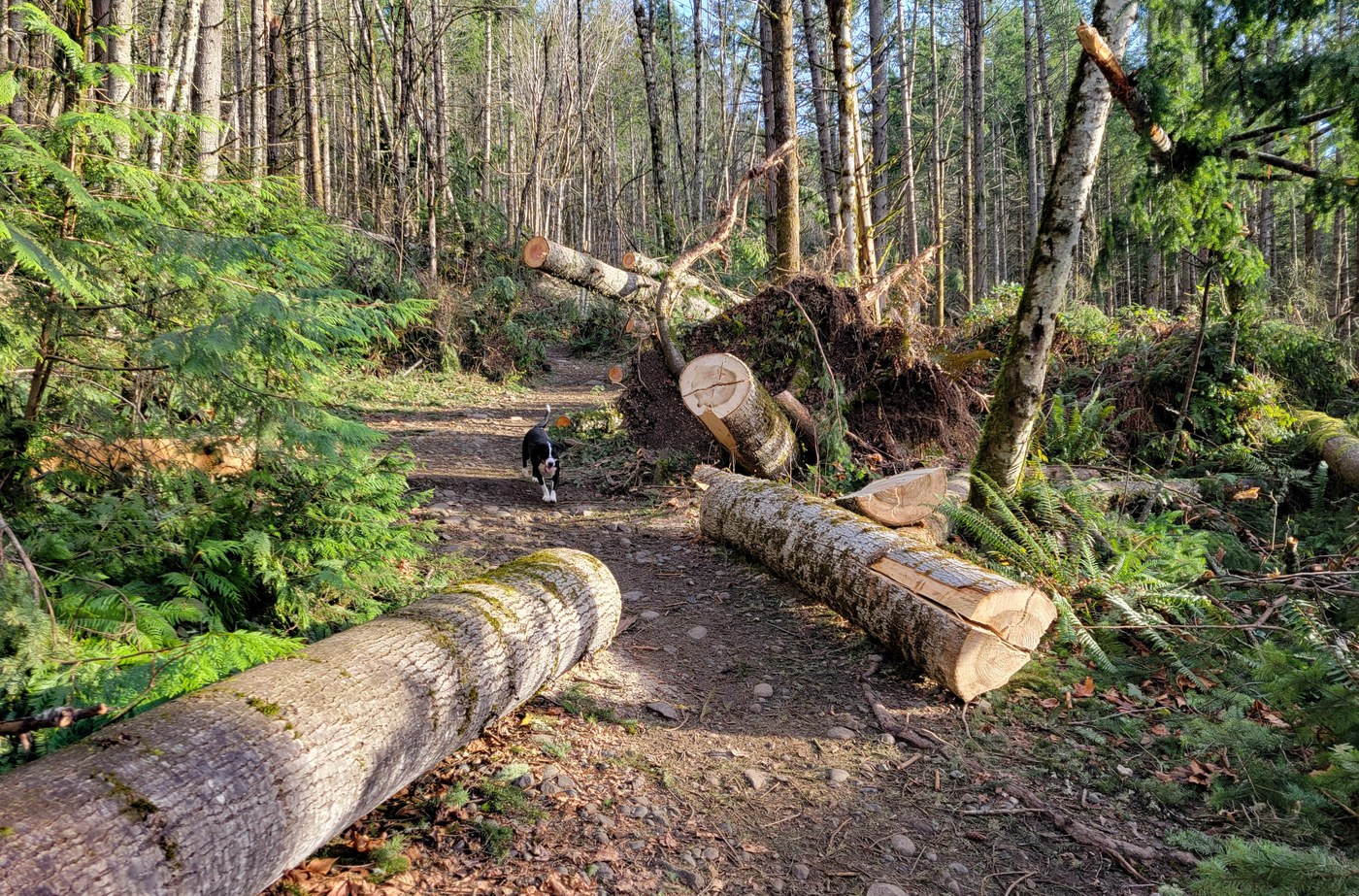 I was so impressed with the amount of work done to clear all the windfall. A big thank you to all involved. The trail is now in excellent condition and there's only one remaining blowdown near the top that is easy to walk over. There are a few root craters from fallen trees that took out the trail tread. This looks like it will be fairly easy to repair. I counted rings on one of the larger cut windfall trees and it was about 220 years old! I spend a little time scraping away some unwanted graffiti from a fence post.