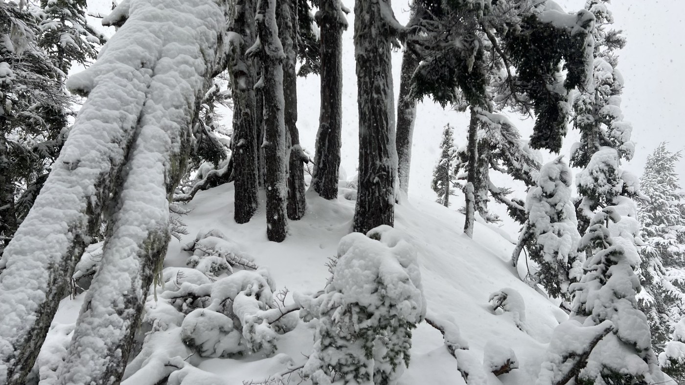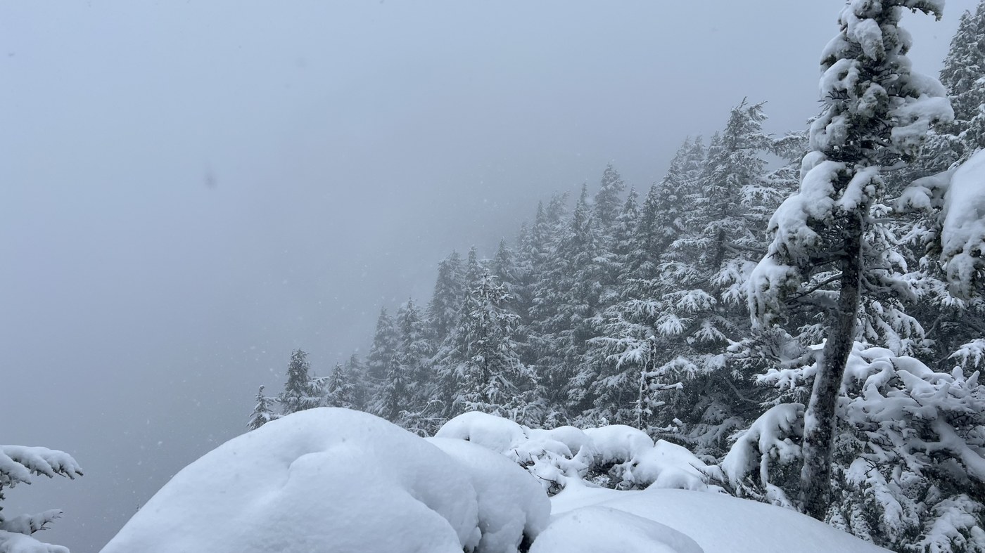 Got to the summit of Dirty Harry’s Peak today, but it took a bit of effort, as I don’t think anyone has been up there since the recent snowstorms. The tracks that I was following stopped about 100 vertical feet from the summit. 18-24” of snow on the ground, with possible more in the track of the trail, as I was post holing up past my knees breaking trail. I went to both views points, both of which had no views. Still pretty up there with all the fresh snow though. Snow became consistent on the trail at the viewpoint above the creek crossing, and the Museum, so no need for micro spikes if only going to here. Creek was flowing pretty good, but there were rocks above the water line to hop across. Poles helped with the creek crossing.