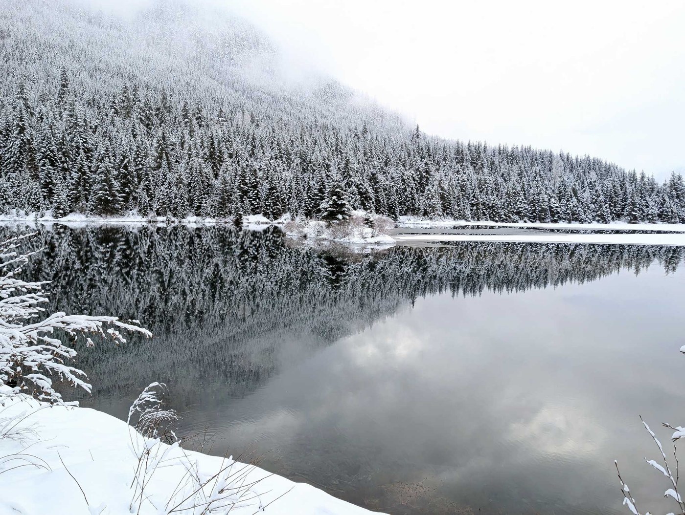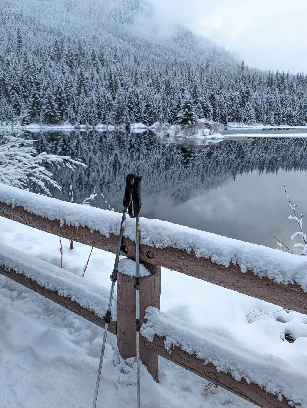 Beautiful snow, thoroughly packed down, snowshoes unnecessary. We used spikes. It's always a beautiful hike! The trail was almost empty when we got there at 8:30am, easy parking. When we finished around 11:30, cars were parked all along the street from the I-90 exit well past the Gold Creek trailhead, several reducing the road to a single lane. And two cars were trying to drive up the unplowed road! Some pretty crazy New Year's Day antics!