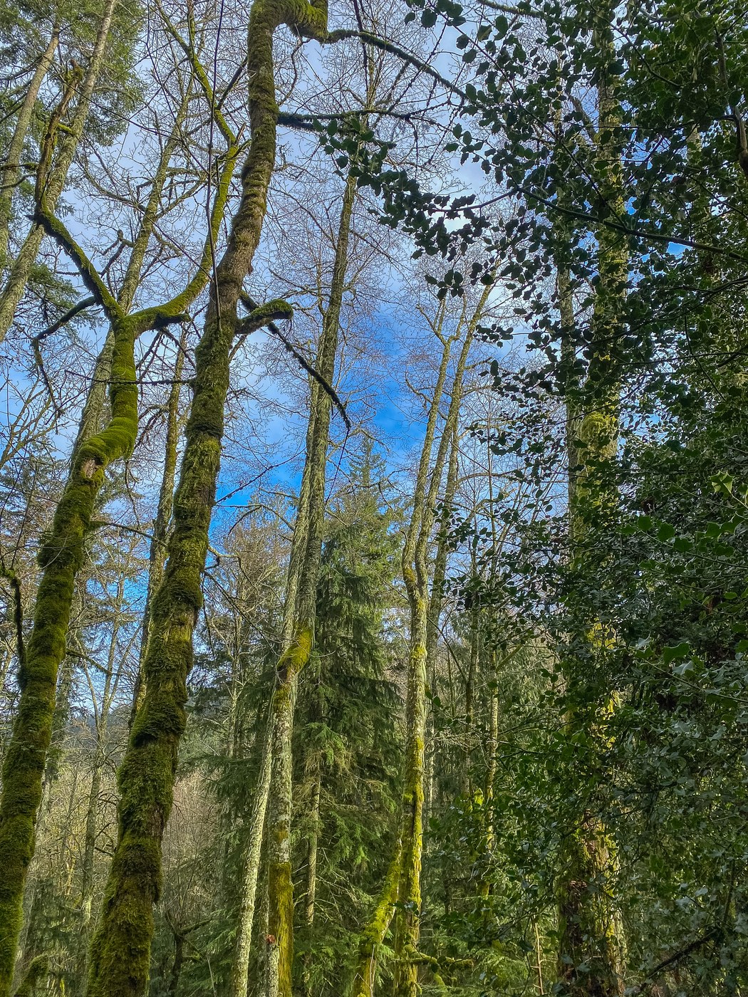 The parking lot was almost full when we arrived at 8:45 a.m. today. On nice winter weekends, expect lots of people. Fortunately, people were spread out on the trail. The trail is in great shape, with no under-overs anywhere. We could still see evidence of new fall-downs from recent windstorms but King County/WTA have done a great job clearing the trail.