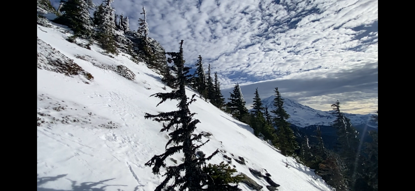 The Florence Peak trail was surprisingly straightforward to follow, just follow the crest of the ridge. Not more than 5” of snow and patchy. Occasional steep patches with slippery shattered ice accumulated from above: Warm sun was making frozen ice bombs rain out of the noble firs- wish I had brought a helmet, and briefly considered turning back with 4” ice chunks plummeting here and there. I finally put on micro spikes here.