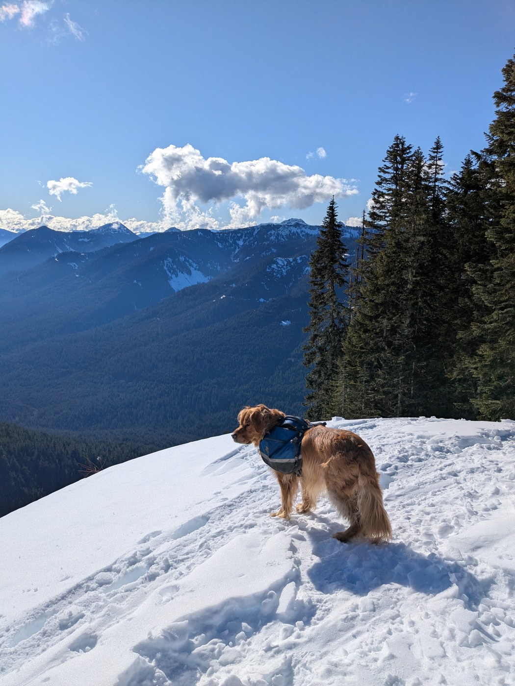 Moose the mountain pup and I climbed Frog mountain on 1/24/25. The previous trip report from 1/20/25 was very helpful. I ended up parking in the same place maybe a quarter mile from the trailhead. If you have a high clearance 4x4 you could make it to the trailhead but I didn't want to risk getting stuck. I brought snowshoes and ice axe but only needed microspikes, gaiters, and poles. There's a nice trail broken now all the way to the summit. It mostly follows the summer trail except near the top (see the Caltopo route linked in the 1/20/25 trip report. I followed the same route). Beautiful views from this trail. Unbelievable this is accessible in late January. Felt more like late November or late May.