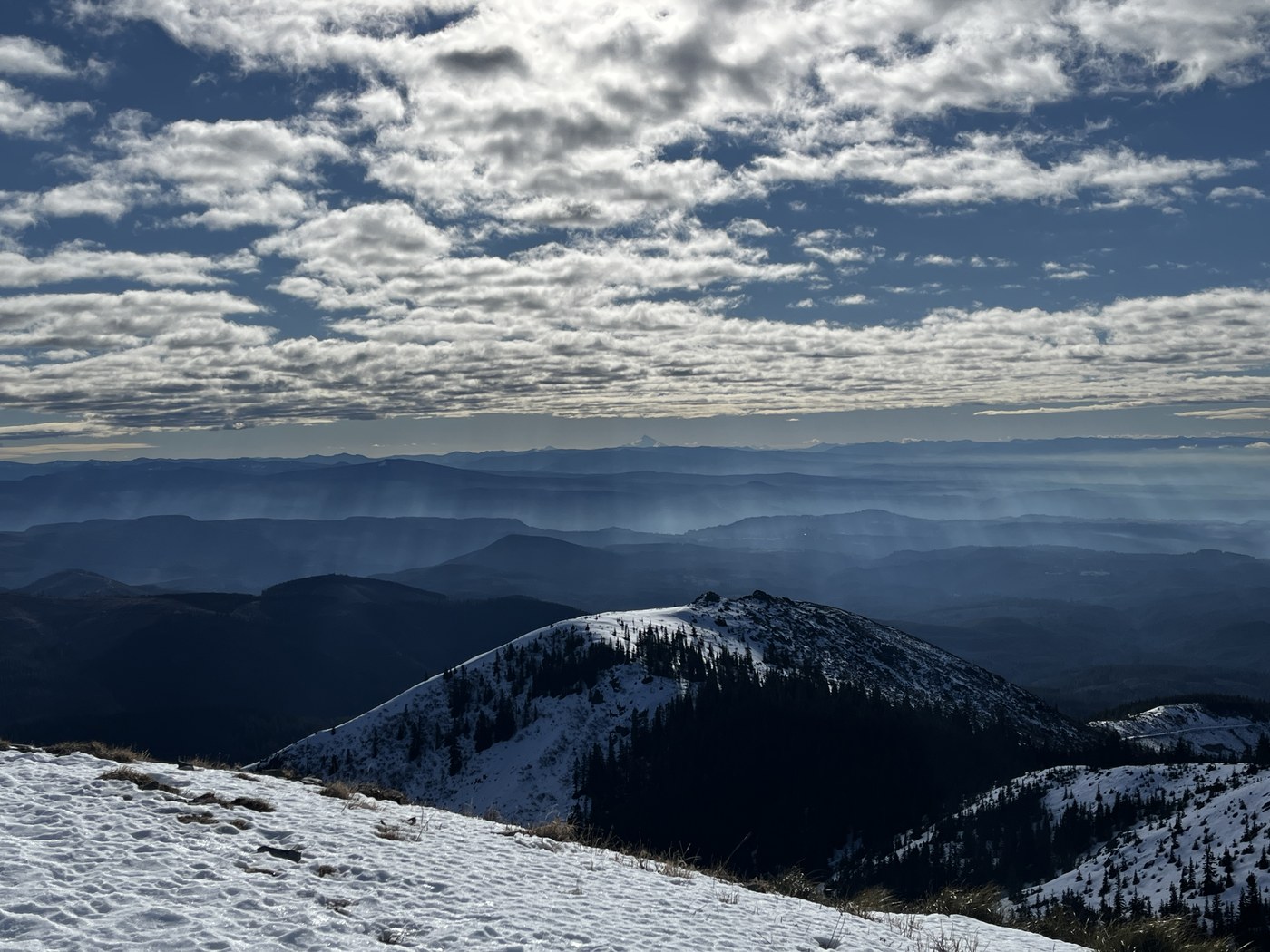 We didn't encounter any significant ice patches until about two miles in. The patches were often on steep sections and the trail became increasingly more icy and snowy as we moved towards the summit, but we had no problems with microspikes on. On top it was very windy and cold. Beautiful views of St Helens, Adams (mostly hidden by clouds), Hood, and Jefferson.