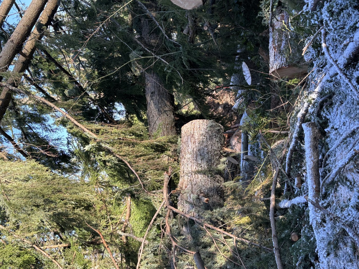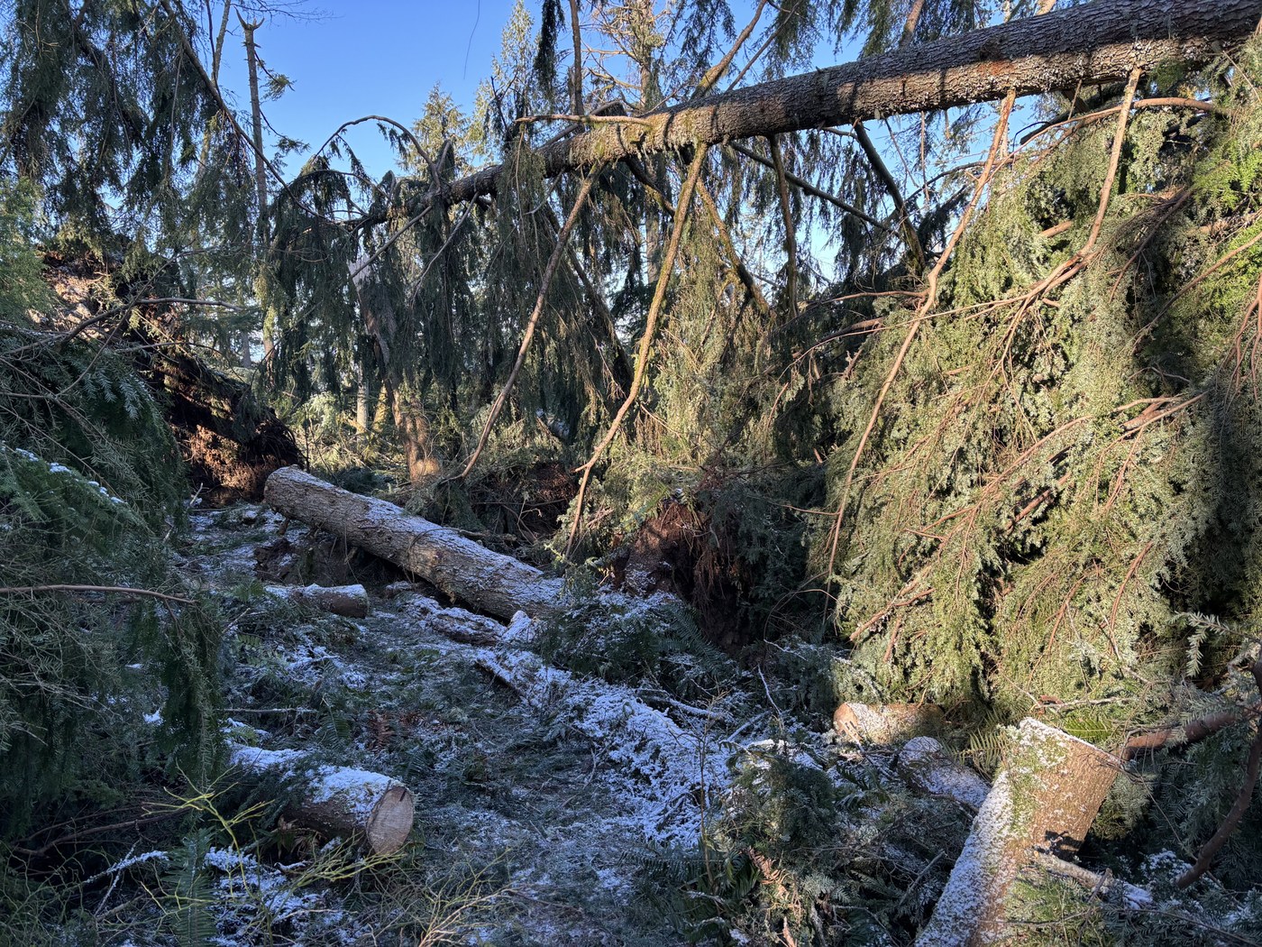 A lot of work has been done but Old Griz trail is still a mess! The trail is currently closed. On Saturday, Issaquah Alps Trail Club and Washington State Parks led a volunteer work party to cleanup some of the debris from the November cyclone. Massive tree fall with logs jumbled in piles and gaping holes where trees were uprooted will make trail restoration difficult. State parks has been busy chain-sawing a path through the downed trees. The volunteer work party cleared smaller debris using hand tools. We made significant improvements but there is a lot more to be done.