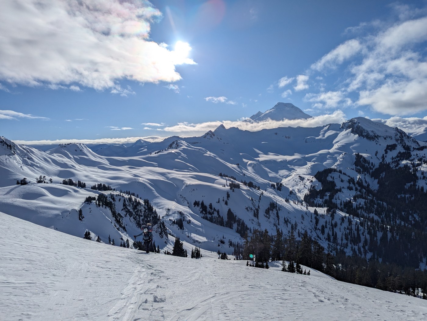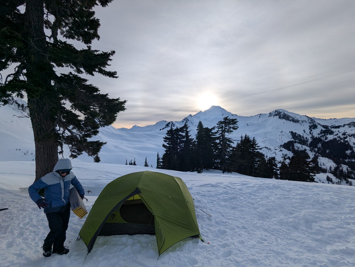 My partner and I began the walk from the parking lot to Artist Point with modest crowds and a path so consolidated neither one of us felt the need for traction or snowshoes. After a short lunch with an outstanding view of Mt. Baker we began the traverse around the south side of Table Mountain. The avalanche forecast for the area was green at all elevations and aspects, but please use your own observations and experience when crossing avy terrain such as this. Fortunately, for us on this day the snowpack was well consolidated, and temps had remained cool enough that we weren’t left with a refrozen sheet of ice. We were able to kick steps and walk all the way to the prominent ridge emanating from the NE shoulder of Mt. Baker with minimal post holing. Here we set up camp for the night and enjoyed the incredible scenery before climbing inside of multiple sleeping bags with a few hand warmers as well…