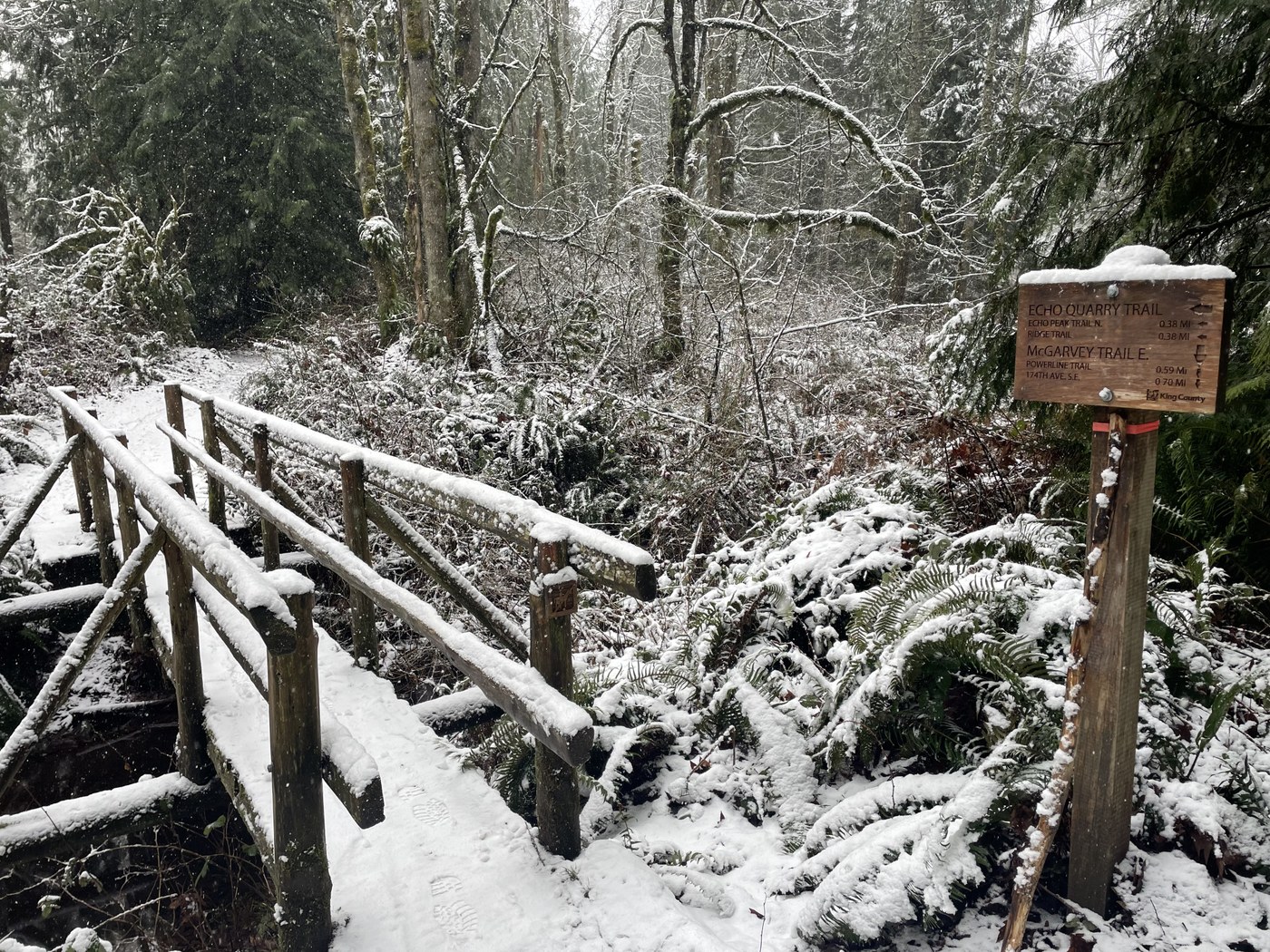 Left my house close to Maple Valley Heights Park at 12:30 and headed into McGarvey Park open space. A short way down the power lines behind the ball field is a trail to the left leading to a lake called on the map "wetland 14 natural area". Its just before you start heading up the first hill. A short distance through the woods and your on a gravel road leading to the lake. You can access this area from a different part of my neighborhood that has a small parking lot at the end of se 170th St. There are apple trees here and some power lines. It was private property at one point but now it belongs to the King county I think. Heading south the gravel heads to left and there is a trail that heads to the right. Following it to the right until there is another fork. There is a sign here and a bridge. Going to the right will take you back to McGarvey Park and a maze of other trails. Go Left over the bridge to Echo Peak (or Mountain), it's called both. The signs say peak on the trail. The map says Echo Mountain. Staying on this trail will turn into the Echo Quarry trail, which leads to the ridge loop trail you will see signs here. Go right and stay right signs leading you up to the peak. I have been up here several times from the Spring Lake Trailhead, but this is the first time from my house. It's just under two miles each way. I used the "All Trails" app making it a piece of cake. Snowing pretty good today I only saw two others on the trail. I took a few pics at the top and headed back the same way I came. Left the peak at 2:00 and arriving home at about 3:00. I have been to the lake a few times and the peak from the direction and have been wanting to connect the trails for a while. I'm glad to have finally put it all together. It is my new exercise walk/run after work now. Happy Trails !