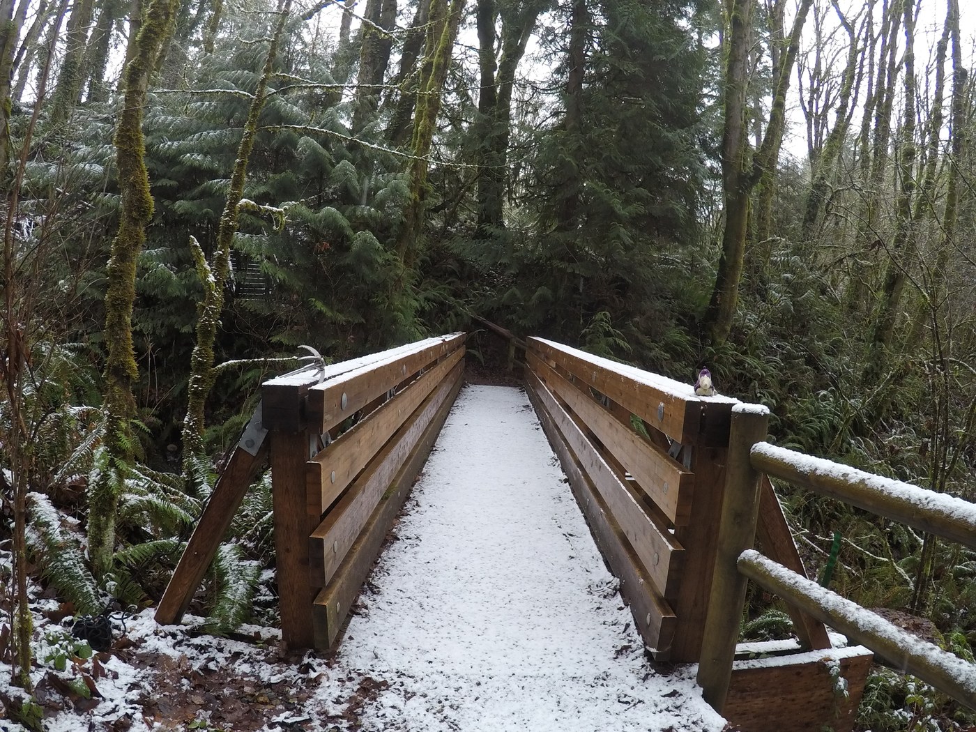 あたしは「COAL CREEK TRAIL」から出発し、目的地は「RED TOWN」です。雪が降って、ハイキングに最適な美しい冬の風景が広がっています。滑りにくいハイキングシューズを履いてください。雪や氷で滑りやすい階段には注意してください。