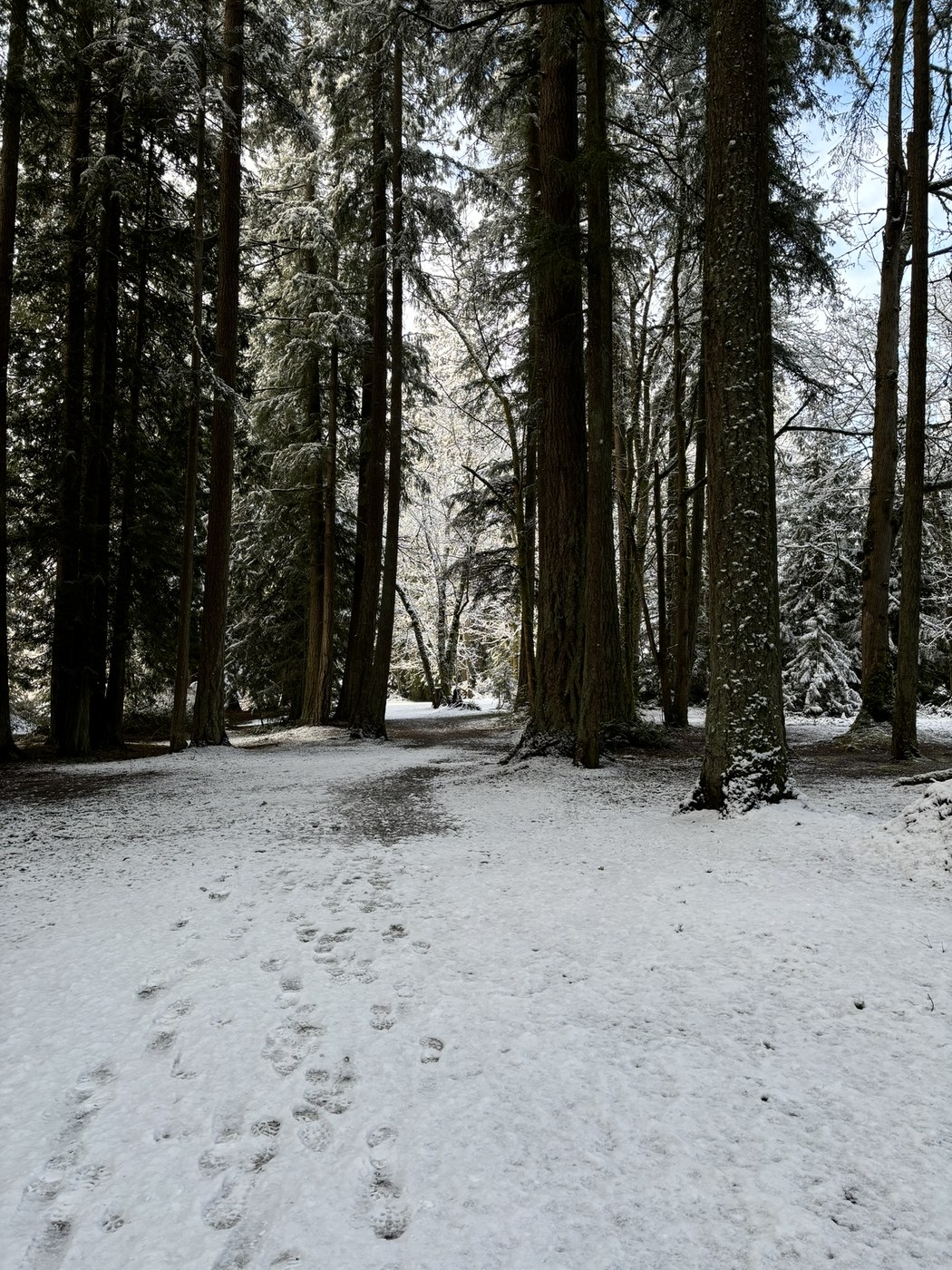 The trails have some snow on them, but they are manageable. The inner loop trails in the forest had only intermittent patches of snow due to heavy canopy coverage in some areas. However, take note that the snow-covered logs are slippery if you have an enthusiastic tree climber as I did. It was a fun outing and the open meadow next to the lodge offered a great space to make snow angels.