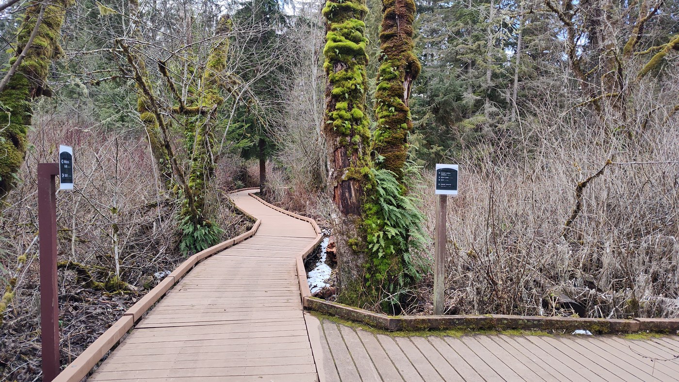 I decided to take a quick walk through West Hylebos after a nearby appointment. The trail that branches off towards the picnic area is currently closed for boardwalk construction but the main loop trail is open. A large area of the boardwalk has been freshly powerwashed, making it less slippery. Most of the informational graphics are removed right now, but there are temporary directional signs with mileage at the intersections. I took the spur out to the lake, where I saw a handful of mallards and a single male wood duck.