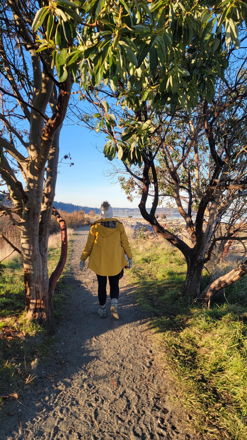 Iverson Spit is one of our go-to quick nearby hike options in the off-season. It is pretty any time of year, but especially nice on a sunny winter day. The portion of the trail along the dike is in full sun most of the day, while the forest loop gets shaded by early afternoon, and the shade was quite chilly when we were there at 3 p.m.