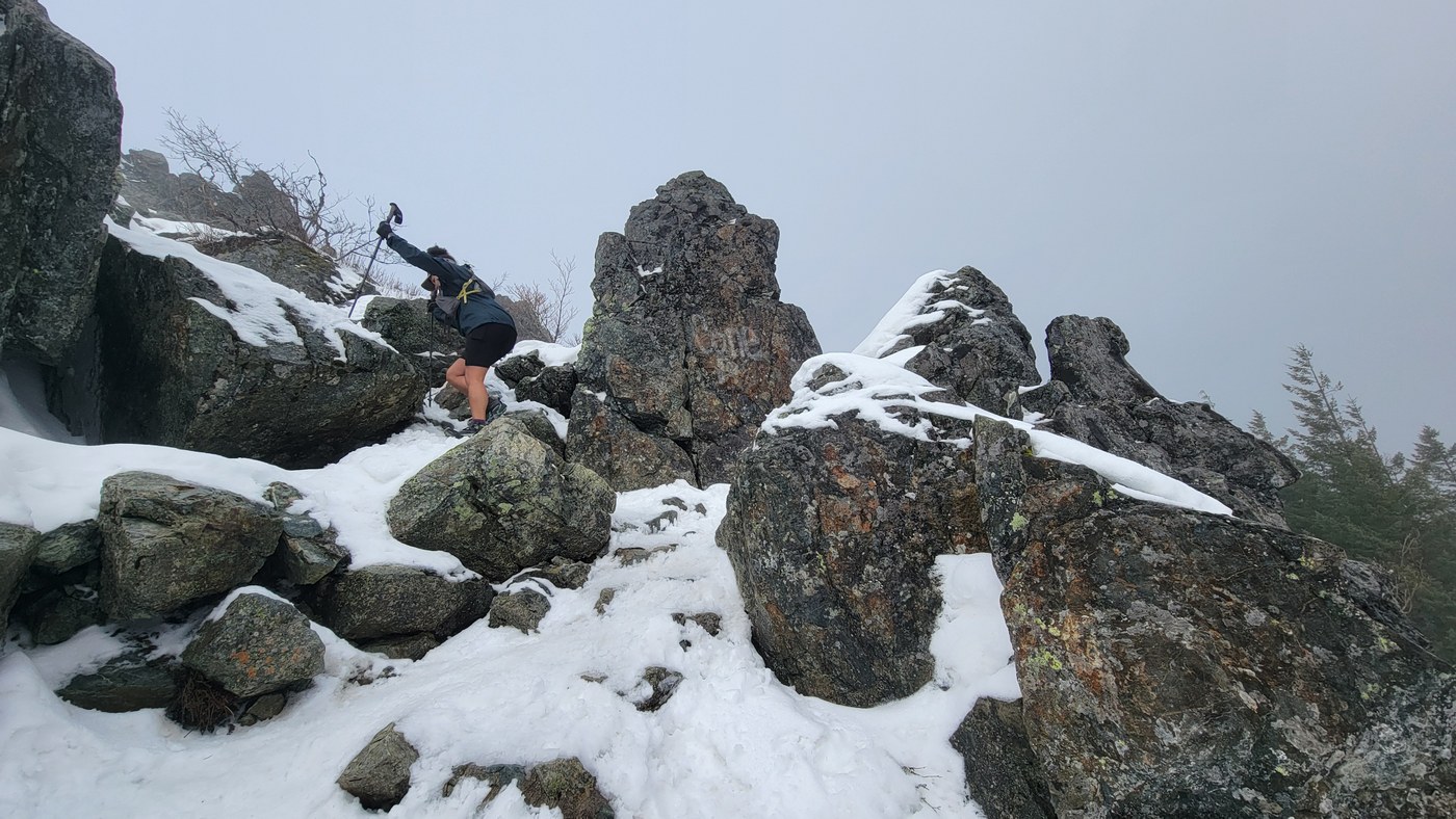 The trail fluctuates between slush and muddy track for the first 2k feet. We used poles and traction from around 3k in elevation to the top. Expect a bit more snow at the exposed summit, and always keep your eyes out for pesky jays. Views were cloudy and we did not go all the way to the Haystack.