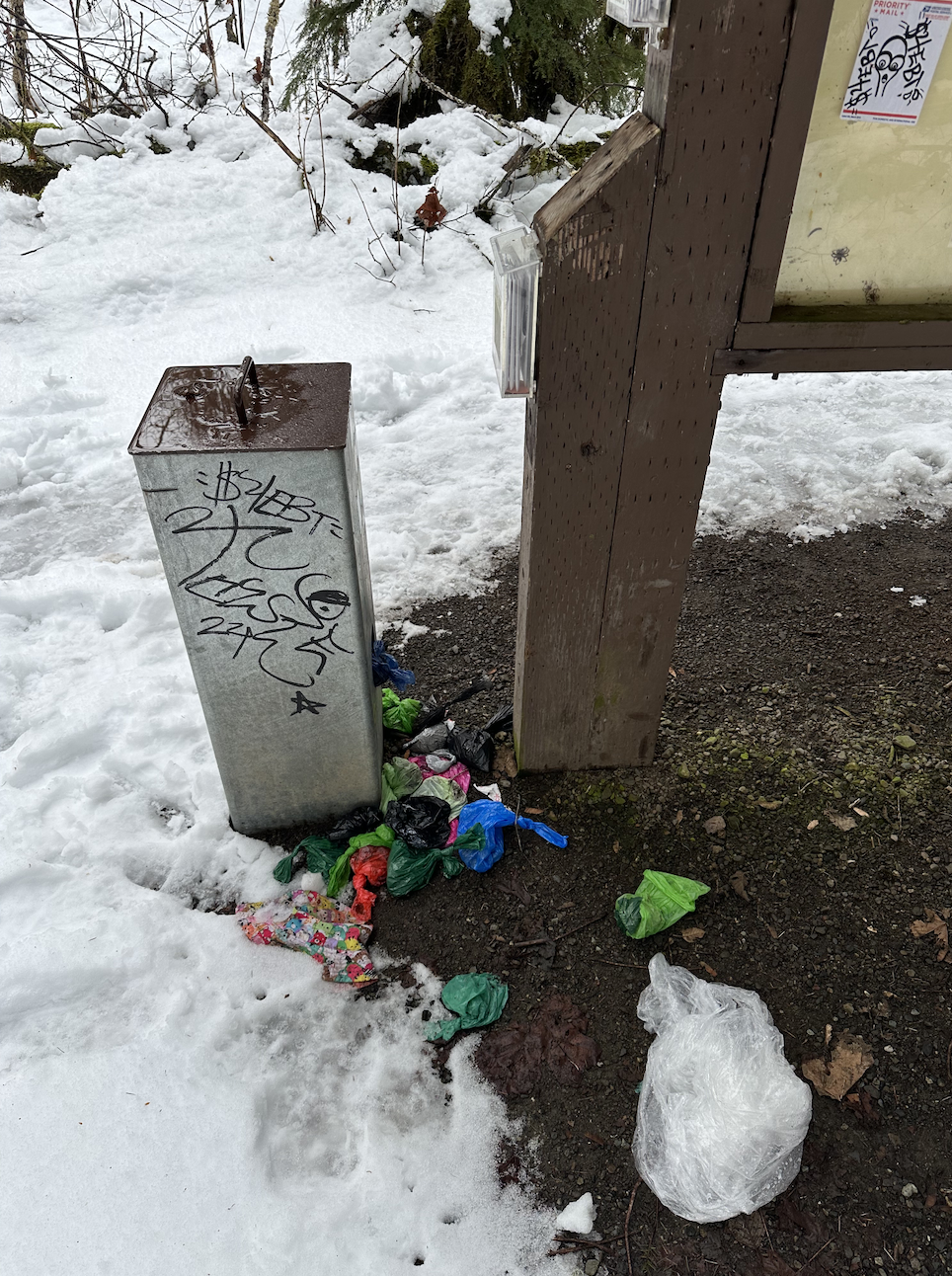If you bring a dog, PLEASE pack out your poop bags or leave your dog at home. There are no garbage cans at the trailhead and the outhouses are closed for the winter season. Unfortunately, people have been leaving their poop bags around/inside the permit envelope box/station, and it's disgusting.