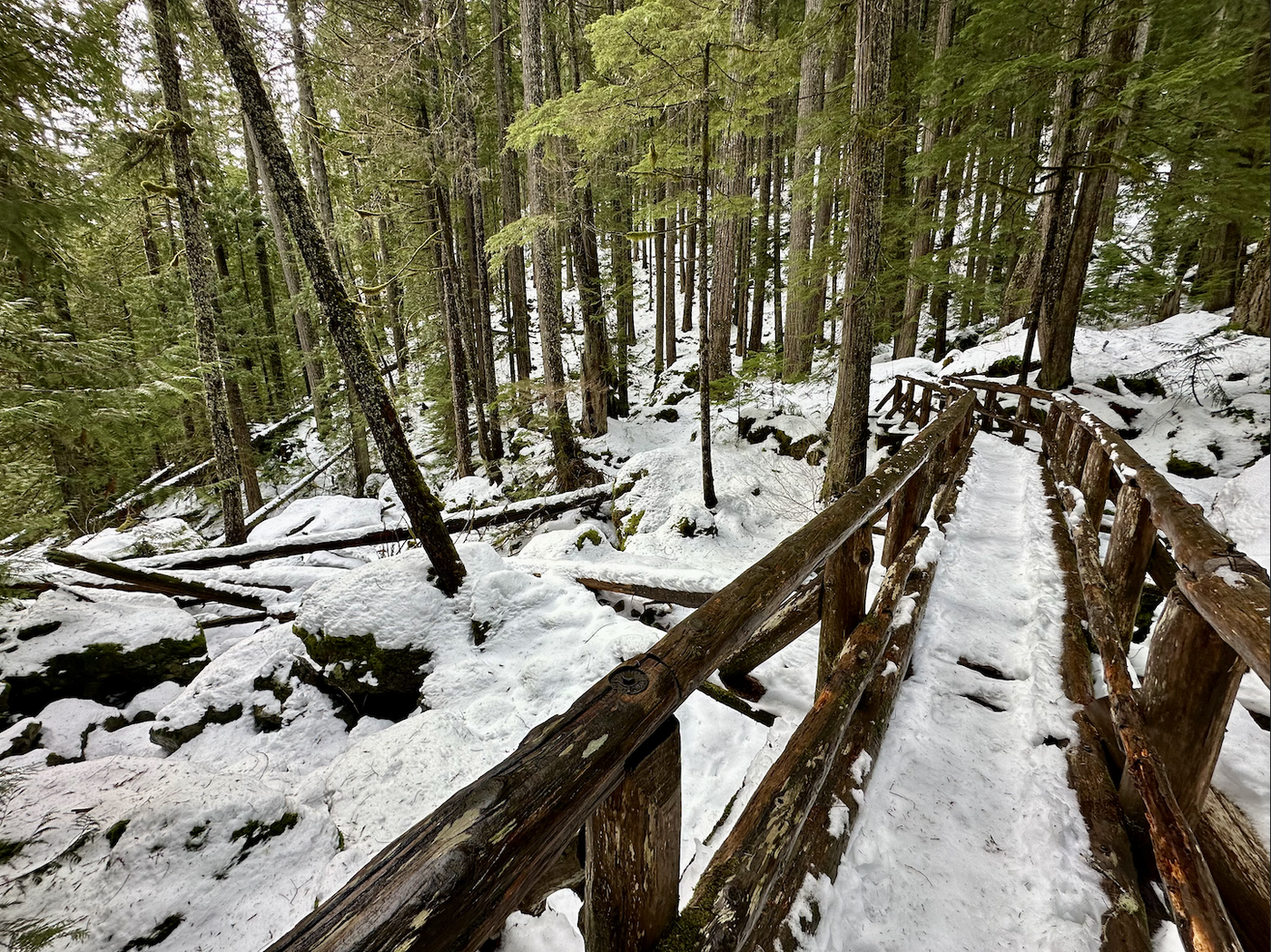 The trail overall is in great condition, all snow considering. We used gaiters and microspikes 80% of the time. Though gaiters weren't totally necessary, they were nice to have for comfort. The trail is quite wet, but the rocks make it so it's not muddy. There were only two small trees over the trail, nothing to worry about. The snow was more slushy than ice, but microspikes made the trip a lot safer and enjoyable.