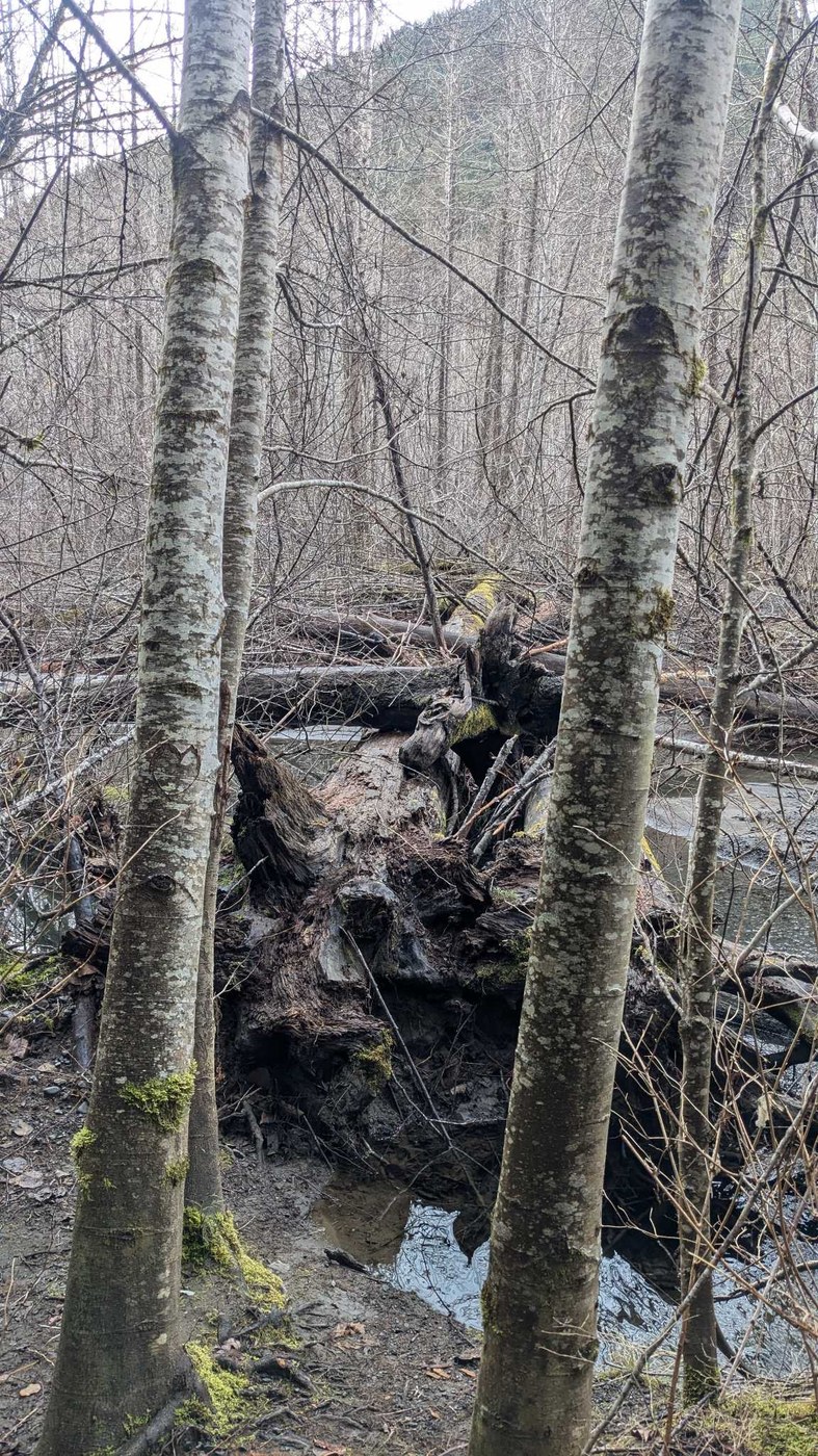 One last thing of note: the long-standing log bridge out to the spit/island at the first camp has accumulated a bit of extra flotsam (see pic). It's always been a bit sketchy/slippery on a good day, but it was absolutely a hard pass for me today, especially with a dog in tow. I'm sure an alt-route is possible, just be forewarned if that's your destination.