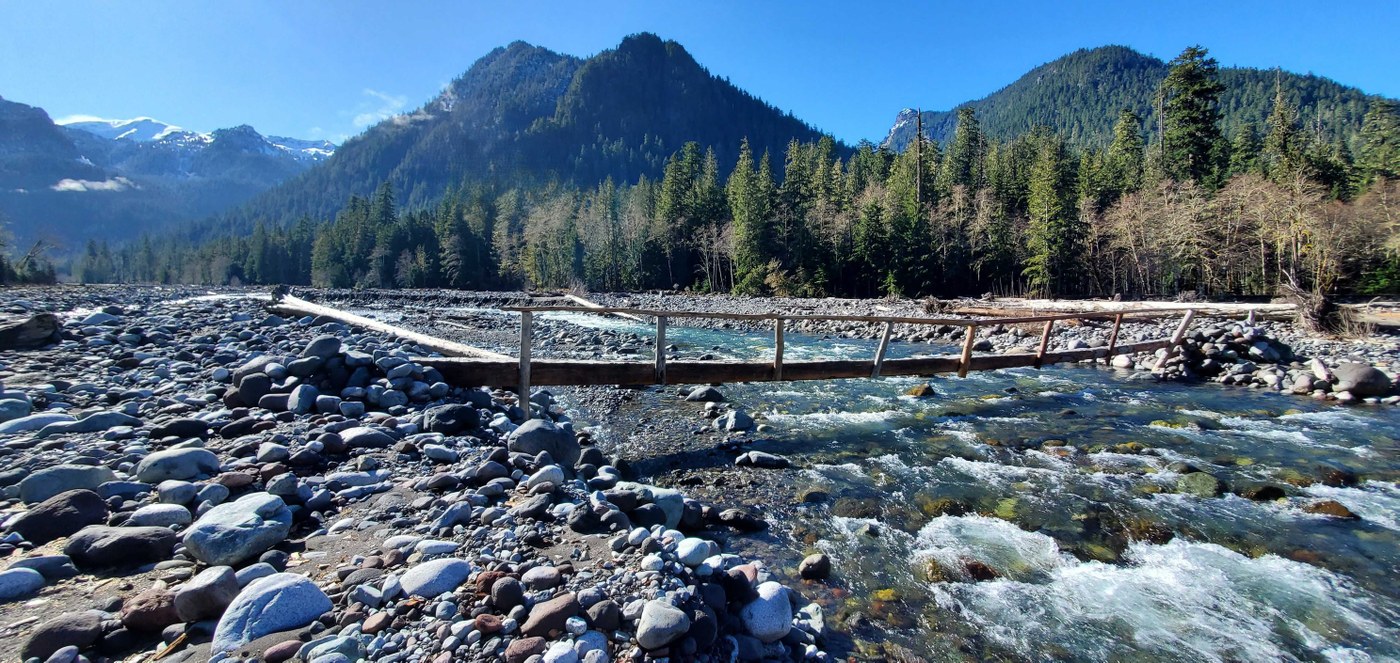 The two bridges over to Chenuis Falls are still in, though you only need the second one - the channel has largely moved out from under the first and you could easily get over via rock hopping instead. There are a couple sections of the trail between the second bridge and where the trail heads into the woods to get to Chenius Falls where a braid of the Carbon has started to infiltrate... will be interesting to see what the Spring snow melt does. Currently you can get through without getting your feet wet if you are careful where you step.