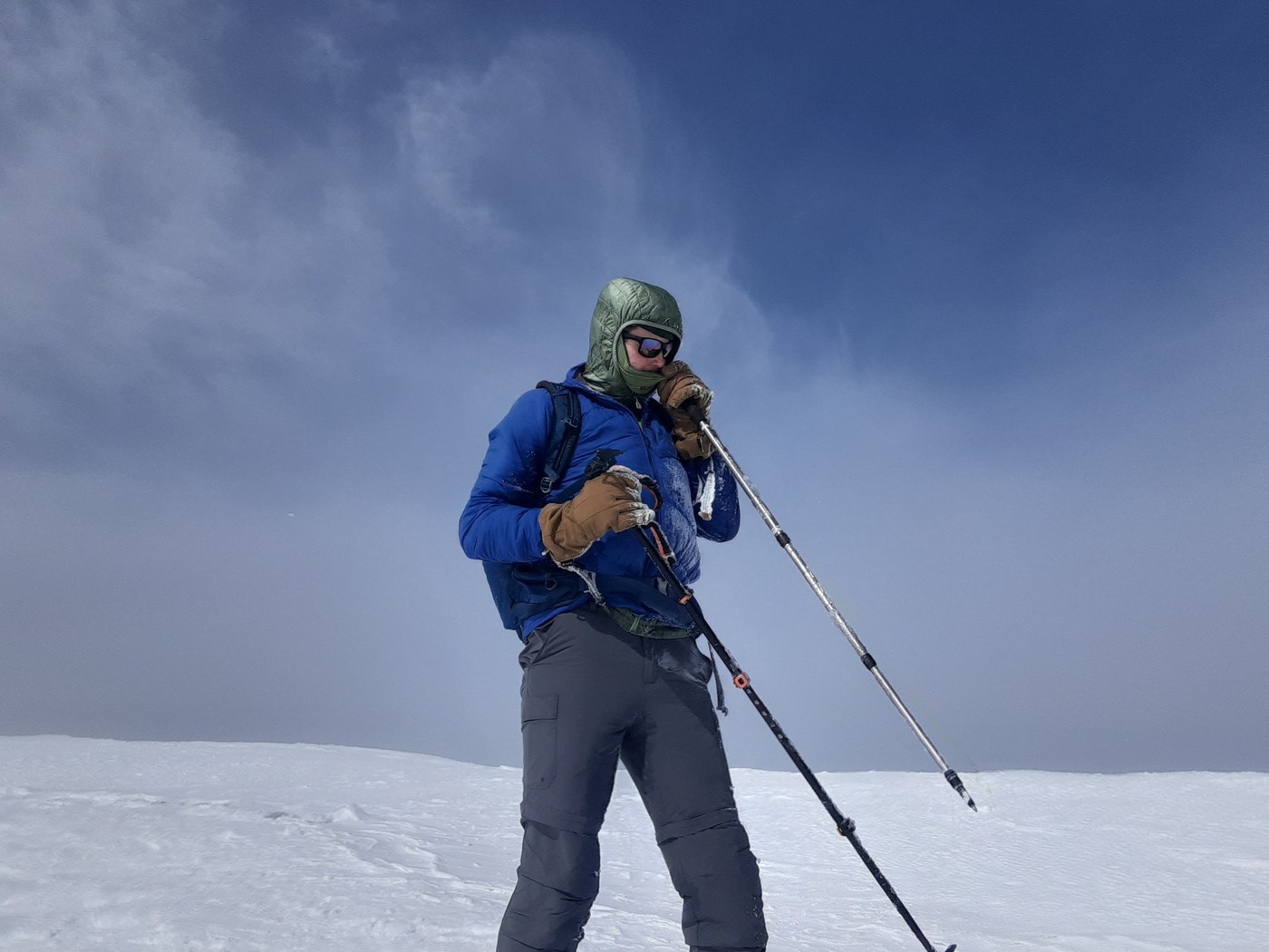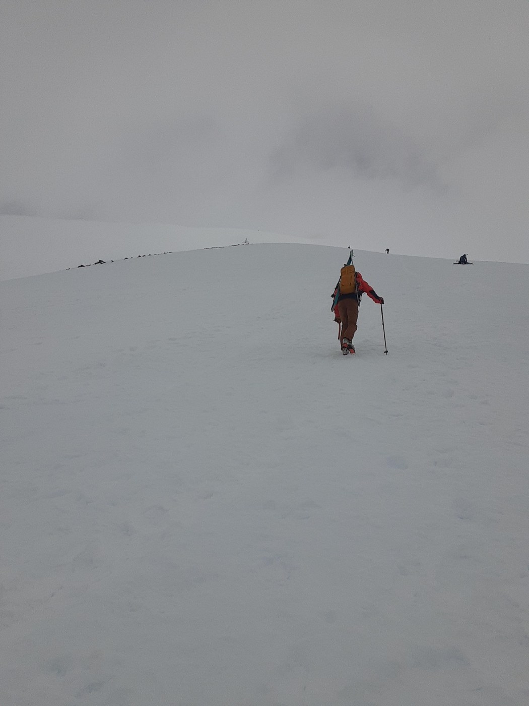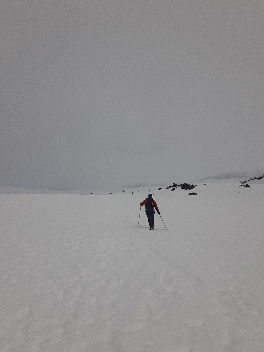 The road, parking lot and trailhead are snow free. The first half mile or so of the trail has patchy snow, from that point on the snow is continuous, compact snow and ice on trail. Starting around 4000 ft the snow was icey with a non breakable crust and this was the case up to around 6500 ft. Between 6500 and 7500 ft there was a few inches of powder with a layer of solid snow underneath. There was a good bootpack up to about 7900 ft at that point there either wasn't a solid bootpack or if there was I lost it, visability was extremely poor near the top. Conditions from 7900 ft to the top were 6 inches of powder on top of an older frozen layer of snow. It was cold and very windy near and at the top, my partner turned back because of cold, wind, and fatigue. I did not stay long at the crater rim. Beware of cornices on the crater rim. I used mountaineering boots, crampons, a trekking pole, and a whippet pole. Bring lots of clothing including a good pair of gloves and face covering if you plan on doing this soon.