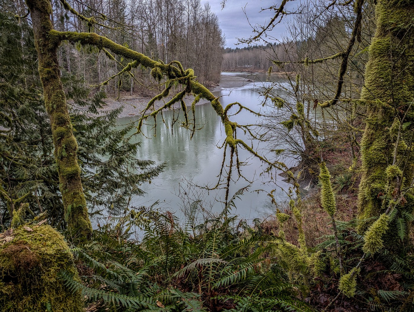 This was a good choice on a dreary day. We walked about two miles starting from the day use parking area then following the trail along the river. Eventually we reached a point where some scrambling up tree roots was required to continue. From there we veered right and went through the yurt area and back down to the parking area. We walked a little farther the other way along the river past the tent camping area. There were some muddy areas but not too bad. The restrooms at the day use area were closed, but there was a porta-pottie staged next to the building.