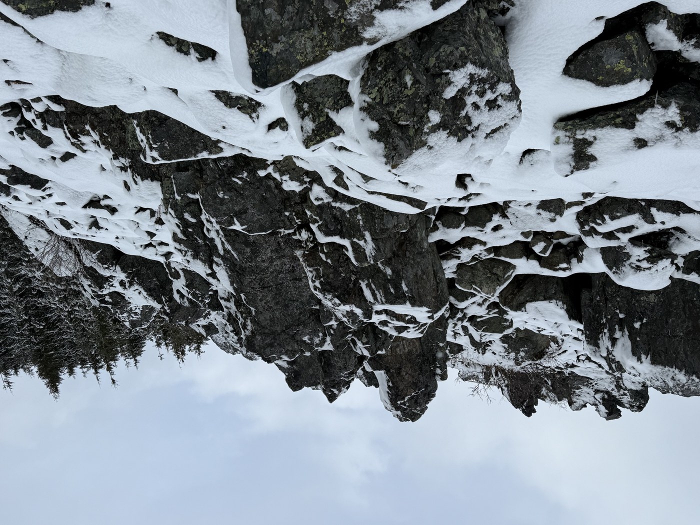 It looked like fresh snow had fallen the night of 3/11/25 - and there were no footprints yet. By the time I was nearly to the somewhat flat area at the foot of the Haystack the snow had deepened to several inches of mostly fluff, speckled with rain and tree snow bombs… and a few blurred and (to me anyway) unrecognizable animal tracks. Snow plus all those lumpy boulders was pretty but made for tricky footing.
