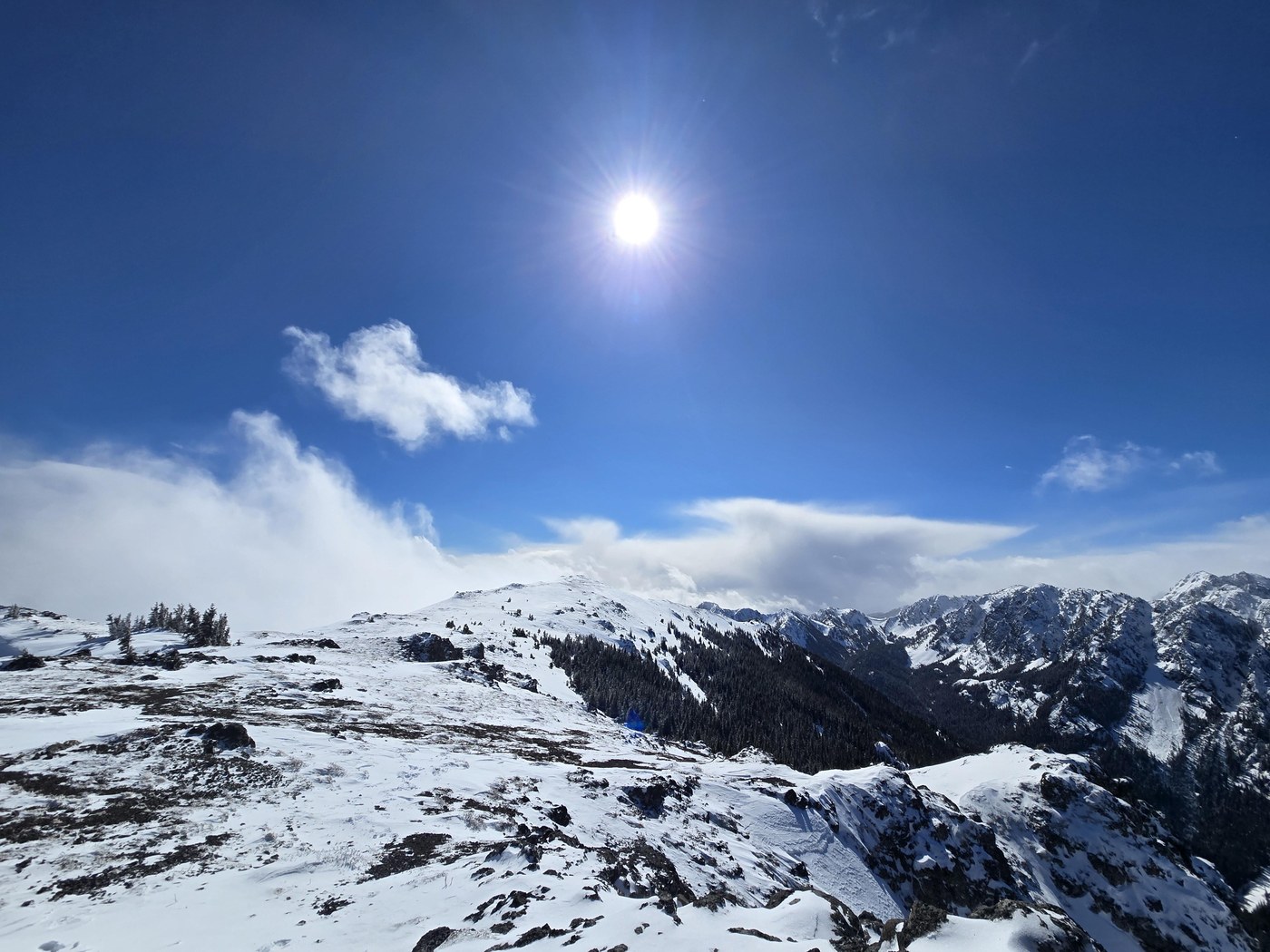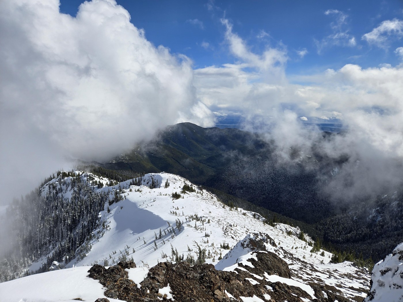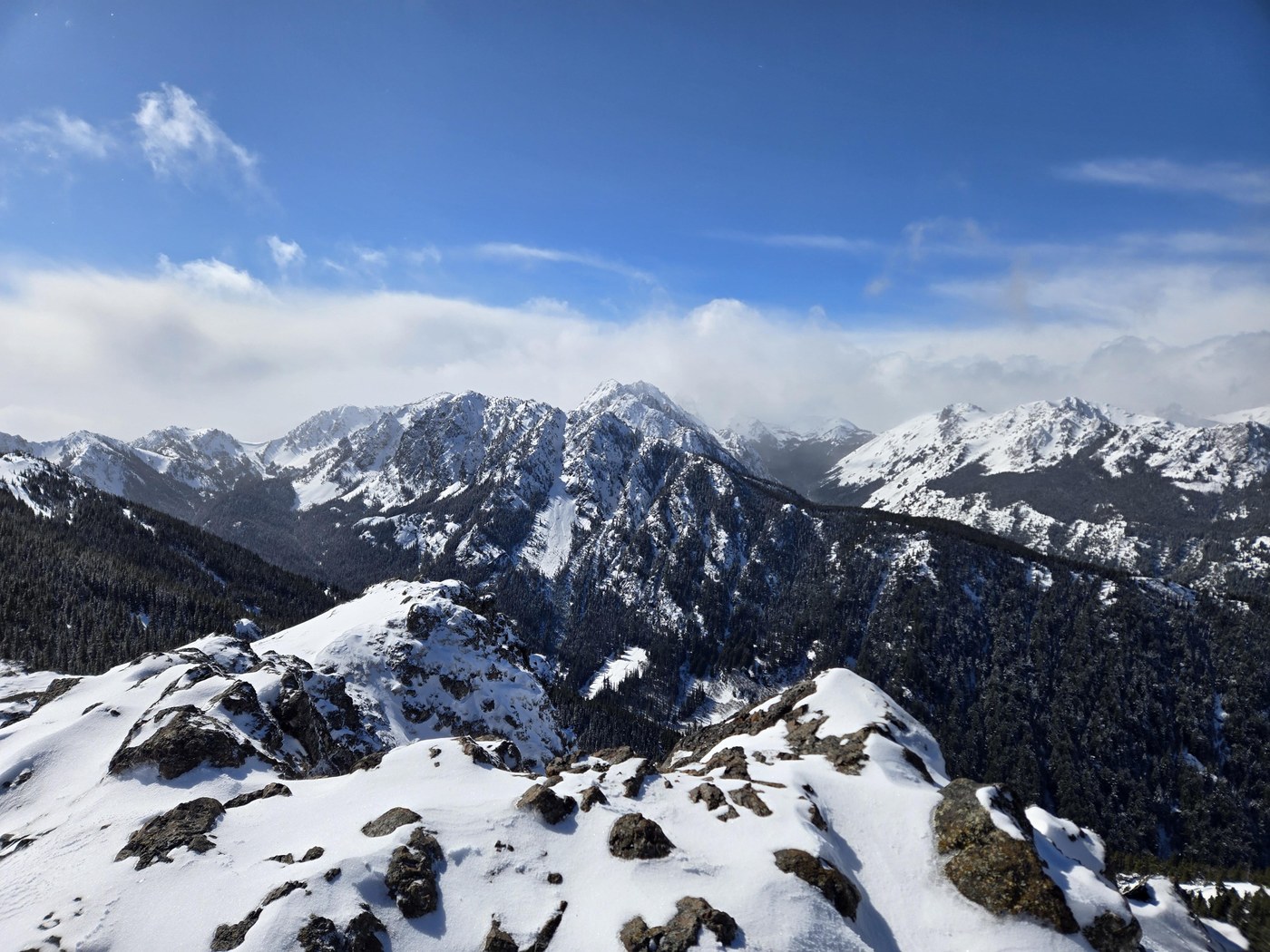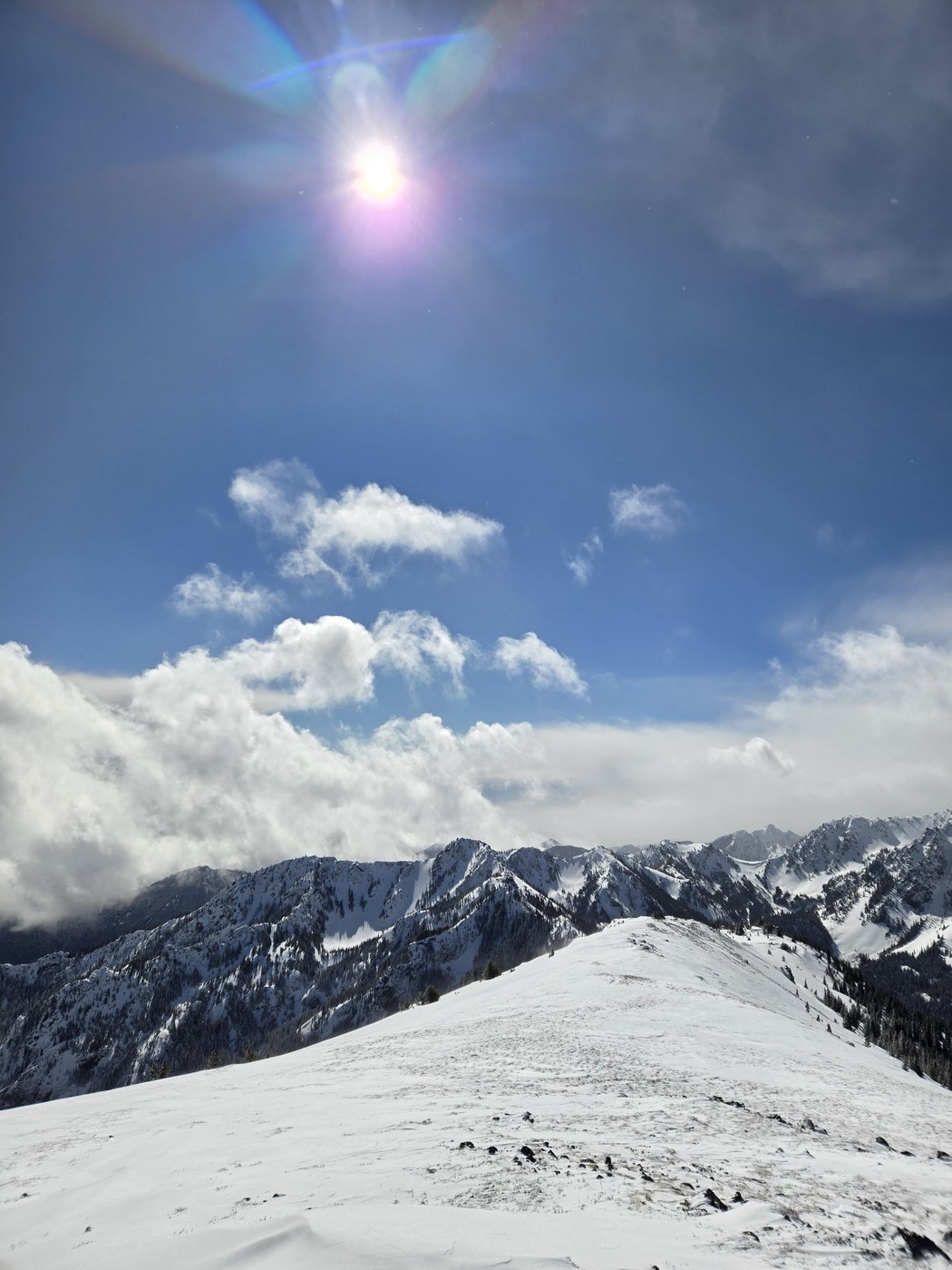 snow on road starting around 3200'. All but the last mile to the upper trailhead should go in all vehicles. The last mile goes with a high clearance 4x4 with snow tires to get over some snow drifts but snow conditions changing rapidly (melting when we departed) we parked at upper TH. Road has lots of litter but no fallen trees. We did not take the summer route to avoid avalanche danger. Instead we ascended the ridge exactly on the wilderness boundary departing the trail at 4120'. Only a few areas of denser bushwhack. Once on the ridge we turned west to ascend Townsend and Townsend North. No floatation needed. Large cornices on north and east aspects. South and West aspects had some patchwork of bare rock. Floatation never used. Don't overthink the ridge it is pretty simple. Windy and sunny