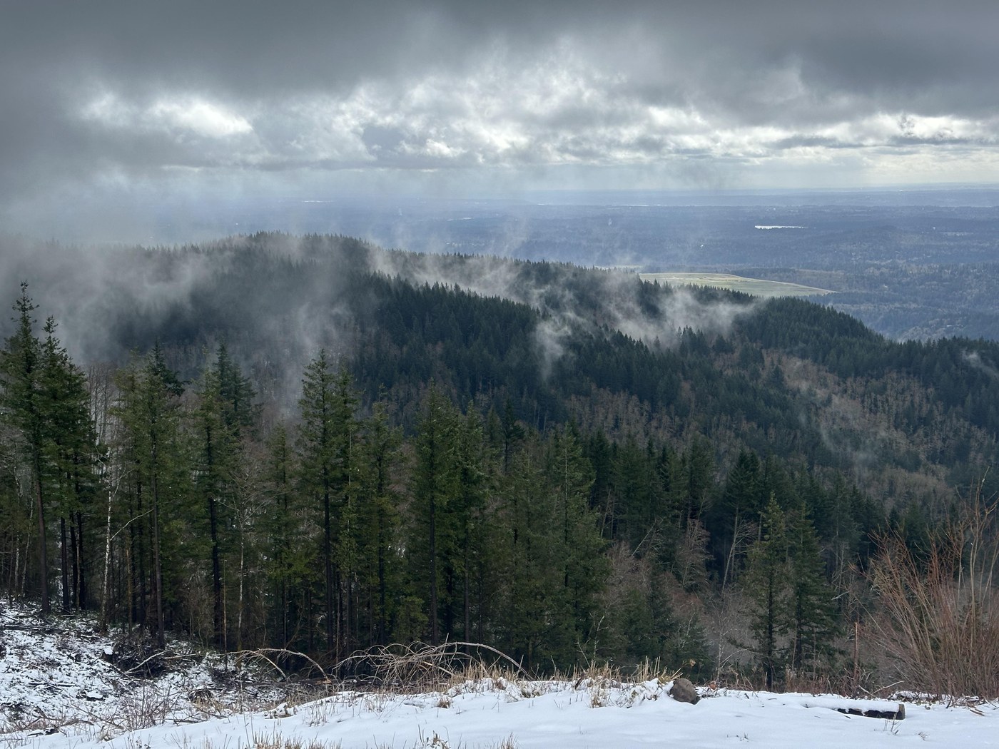 The Trail: Started at the West Tiger 3 trailhead and went up the West Tiger 3 trail until I got to the West Tiger Railroad Grade. I took this off shoot. The snow started to cover the trail around here. This is a less traveled trail, so there were some downed trees and a tricky stream crossing with the snow, but nothing too bad. I connected to the K-3 trail and made my way straight up to West Tiger 2. It was not raining, but the snow was heavy enough in the trees and it was hot enough that it was very wet with lots of slushy snow and water falling overhead. Once I got out of the trees it was back to being dry, but traded that out for the wind. After getting up to West Tiger 2 I went down the backside to check out the Dramatic Erratic, I giant glacial boulder that had a label on the map, back through the trees between 2 and 3 where again snow and water were falling steadily from the trees, and then back up to West Tiger 3 where it was again very windy for lunch. Went down the Section Line trail all the way to its intersection with the high school trail and headed up to the swamp trail. This section was very wet with lots of running and standing water on trail. I clocked 8.5 miles and 2500 ft elevation gain.