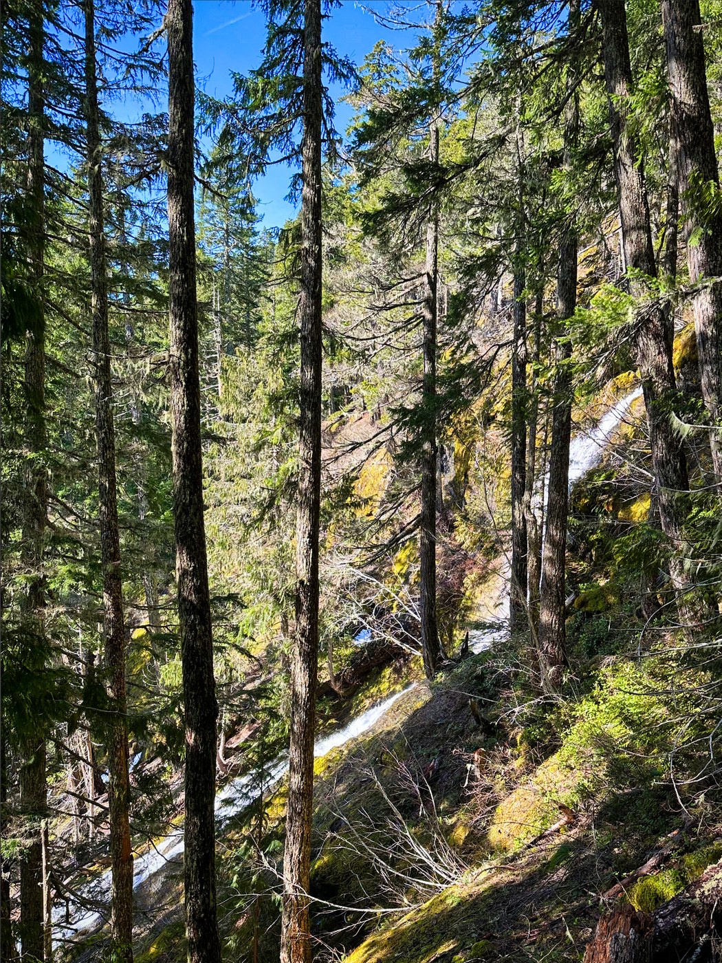 There was a thin layer of snow starting at Horse Camp. Since this was my turnaround point, I decided to take a closer look at the waterfall just west of Horse Camp. There is a faint trail that leads to a ridge where the waterfall comes into view. Because of recent rains, water was running at high volume. The top part of the falls is characterized by a 40-foot drop into a small pool which then spills over onto a smooth rock ramp that runs several hundred feet downhill at a 30-degree angle. Certain parts of the terrain allow for a close inspection of the waterfall. It was mostly a day of solitude. I didn’t start seeing other hikers until my return trip downhill. I took a detour that follows a spectacular mossy ridge and eventually rejoins the main trail. Out and back to Horse Camp is 3.75 miles with 2100 feet of gain. It’s a great destination for early-season conditioning.