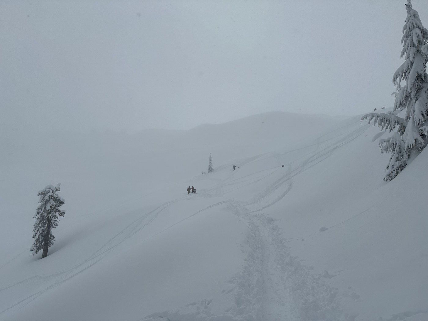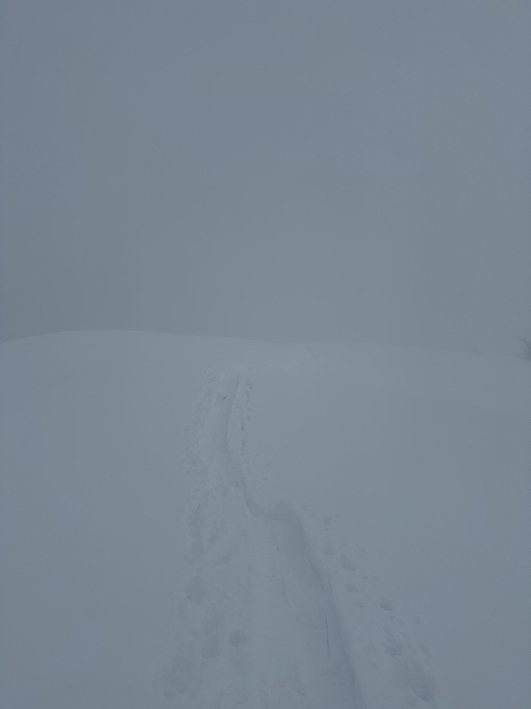 Moderate snowfall increased and visibility dropped significantly the higher up we went. Made it up to Artist Ridge nearby the parking lot but could only see 20ft in whiteout conditions. Went about half a mile towards Huntoon Point before calling it quits due to the weather and heading back down.