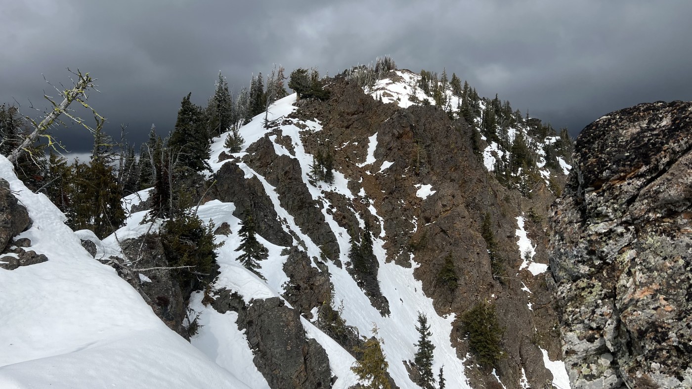 Up at 6000ft we ran into some super steep terrain. Ngie put on crampons and took out their ice axe for this part. I didn't have my ice axe with me or crampons, so I just went up the super steep slope with snowshoes. Up at 6230ft we got to the top of a sub peak, and had to do some scrambling, along with some tricky down scrambling to get to the saddle between Goat Peak, and this sub peak. After this, it was a steep snowshoe up to the summit. Some awesome views from the summit. The top of Mt Rainier was in the clouds along with Mount Aix, but we were able to see so many other peaks, along with Bumping Lake. It was a bit windy on the summit, so we didn't linger long.