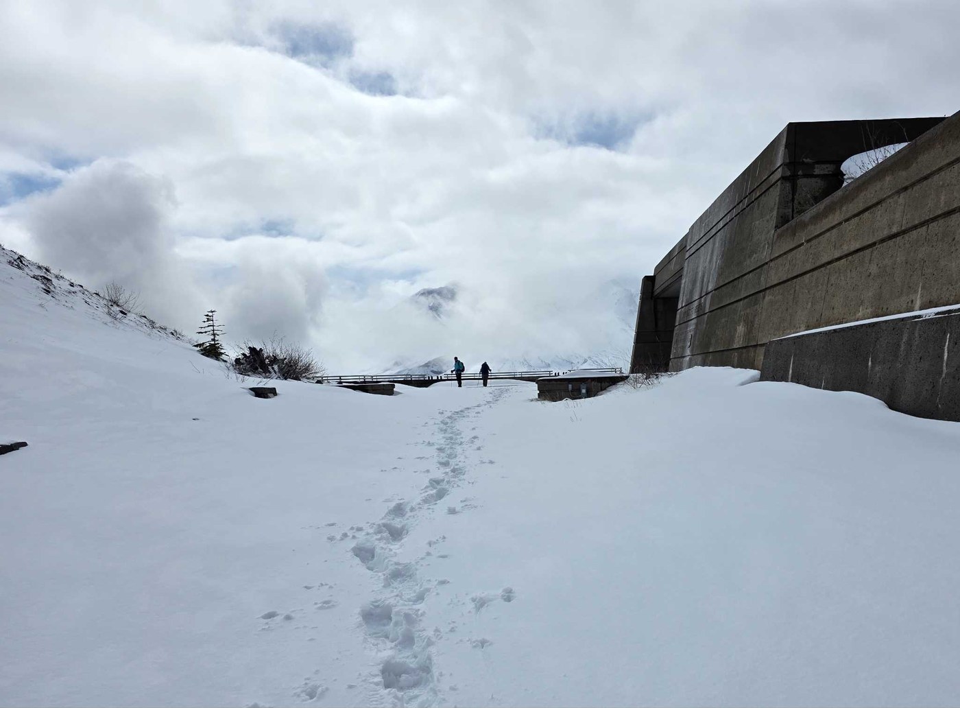 This is an amazing trail with views of hummocks, wildlife (especially if you go early), and Mt. St. Helens, the star attraction. We hiked on Saturday, March 29, 2025. The trail was clear, just a skiff of snow above zcoldwater Lake, until you cross the creek and get into the trees. There the snow was deeper, except right under fir trees. That lasted less than 1/4 mile, and no traction devices were needed. Once out of the trees, the trail was clear to Loowit, except for one short snowdrift that had footprints to walk in. The snow gradually got deeper from Loowit, up to about a foot deep near the observatory. There were mountain goats below the JRO, and also on other ridges, even by where you see Coldwater Lake. We saw elk on hummocks and in the valley below Loowit.