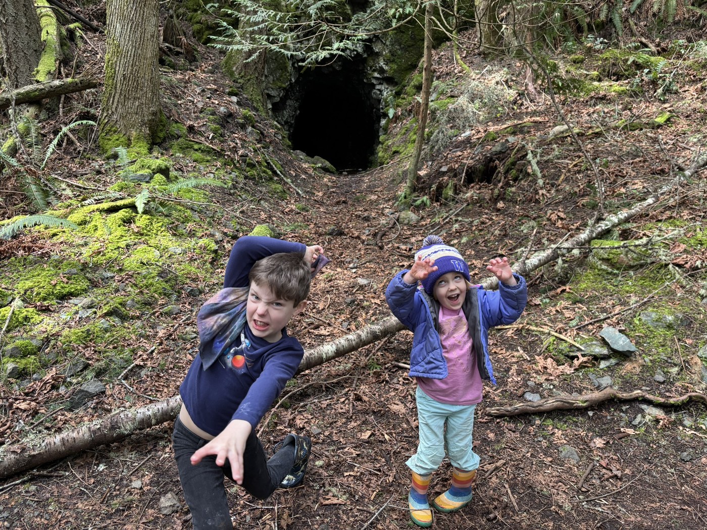 My son was curious about the abandoned mine and cabin ruins off the Tursi Trail after I told him about running past it on a trail run so we went searching for the cave. We started at the Pass Lake loop to the Tursi Trail, which was lovely and shaded, although a bit muddy once pas the lake. Skunk cabbage is blooming as are fairy slippers and giant fawn lilies. The kids played with rolly poly bugs, aka potato bugs, aka wood louses, aka pill bugs while we ate lunch near the balds at the top of the trail there were also plenty of ladybugs to play with. The kids liked playing hide and seek behind some of the larger trees on the trail but were unimpressed by the old mining tunnel. After our walk we went to Rosario head and learned about Elsie May the elephant seal from a NOAA biologist and played on the beach. Finally we soaked our feet and played on the new play structure at Bowman Bay. The kids had a great time and my 7 year old was excited to learn the elephant seal was also 7.