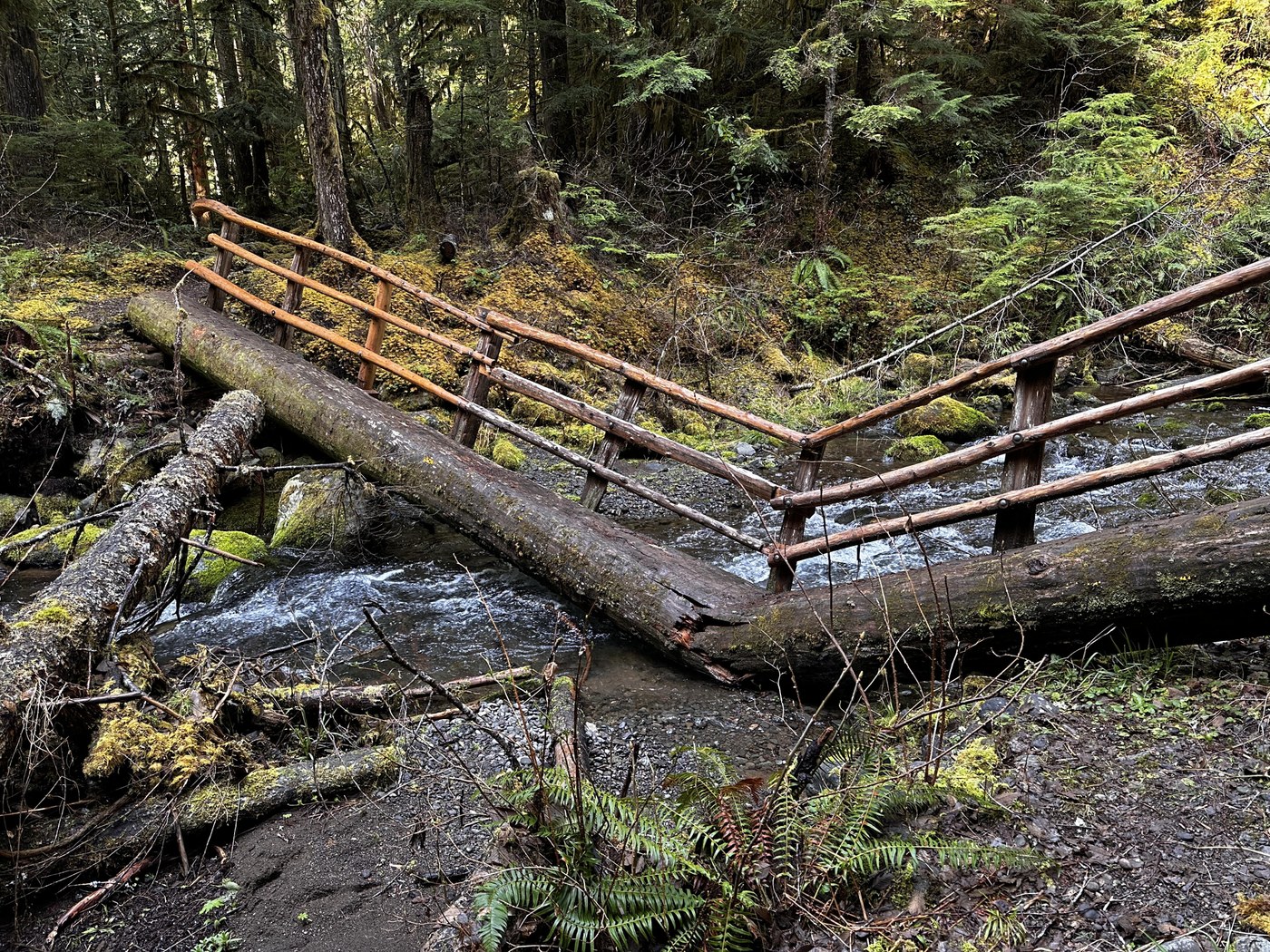 This is one of my favorite hikes in the early Spring as it is GREAT EXERCISE (up and down and down and up and down), snow-free when other trails nearby are not, and few people on it. We hiked this trail in mid-Jan (see past report) and while all the same large trees are still down across the trail (but fairly easily gotten around), the smaller ones have been removed. The BIG change is the footlog across Townsend Creek on lower Notch 3 has collapsed! This was a WTA project in 2010 and sadly the log was not in prime shape then and has rotted away fairly quickly. I do not believe this log is safe to cross the creek at this point. Please be very careful. The creek is running swiftly, there are logjams down stream, the collapsed bridge is steep and slippery - just no!
