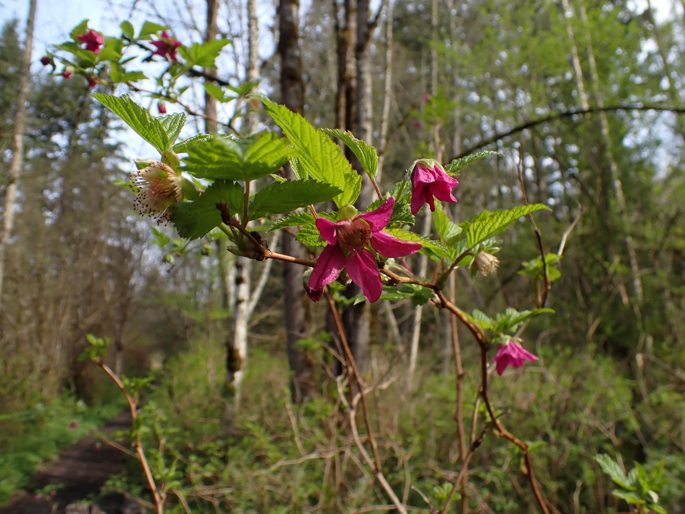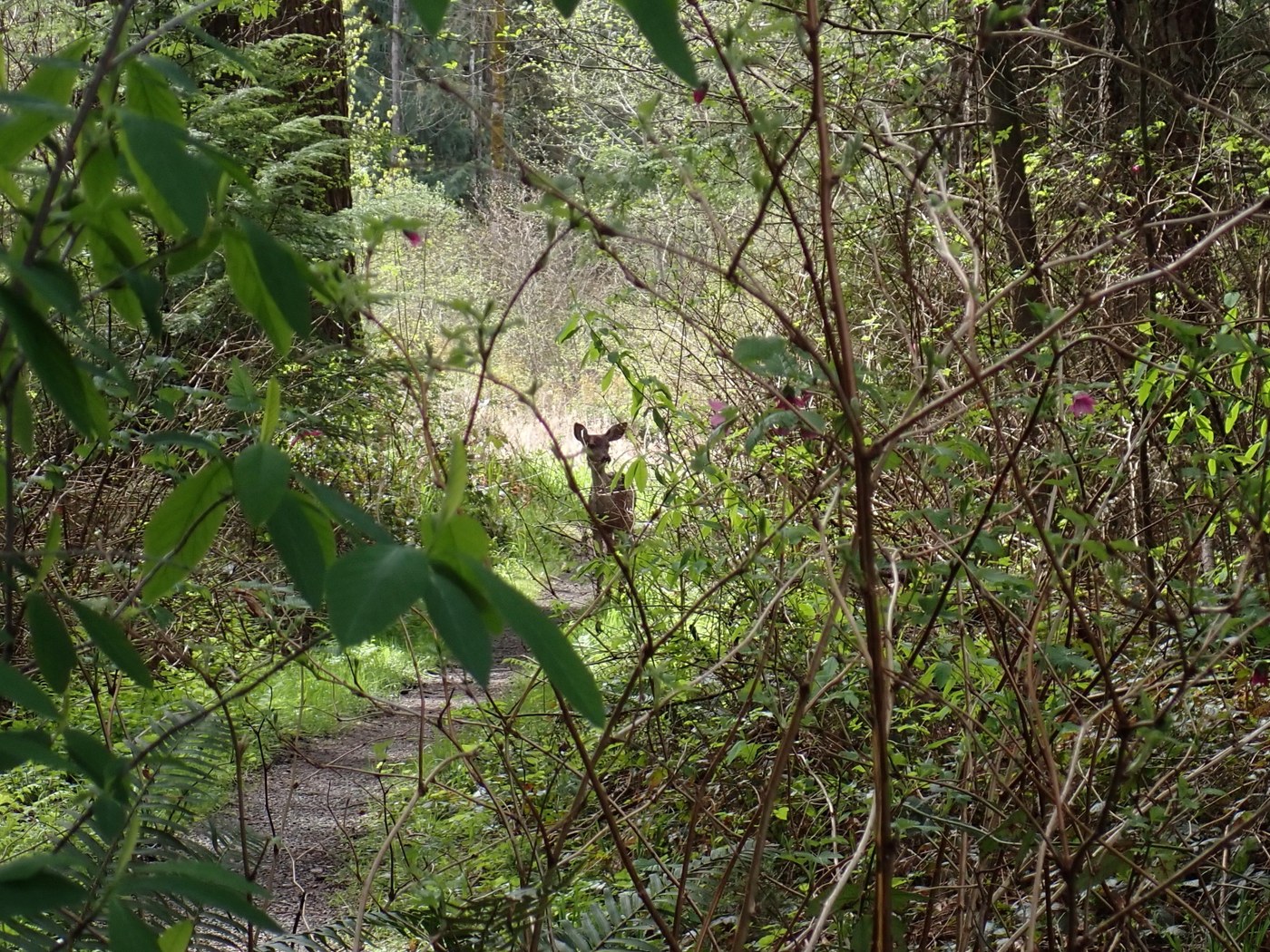 What an underappreciated gem of a trail system! It's not large and there's virtually no elevation gain, but it's a quiet trail and great for forest bathing in the spring. There is also a little section with a playground and a small farm area complete with animals, goats, sheep, a cow, chickens, ducks, pigs and horses for kids to visit. Spring is a beautiful time to walk here, lots of birdsong, wildflowers in bloom, and new green leaves on the shrubs. The Woodland trail is the main trail running from the North parking lot to the South. The farm is on Charlottes trail (pretty obvious). We took a lot of loops, first the Parameter trail and loops on the east side of the park. Here it is shady with Mackey Creek running thru the middle. This trail has lots of trillium and spring beauty blooming. Please teach your kids not to pick them! Pick a trillium and it takes several years to recover, so please leave for everyone to enjoy! Winding around the park we took the Nichols trail back. This is sunnier and we found lots of native PNW bleeding heart, salmonberry and Oregon grape. You will find skunk cabbage everywhere in the park. We came back to the parking lot and did some more looping around the middle. Once back to the parking lot, we walked up to Juel park to eat lunch. No trails but a community garden, restrooms and frisbee golf here. Back we went and hiked down the PSE to the road and and coming back we saw a deer. A satisfying 5 miles. We came in from the north, Woodinville Duvall road to Avondale and a left on 116th, right on 196th to the North parking lot. Loo clean and stocked today.