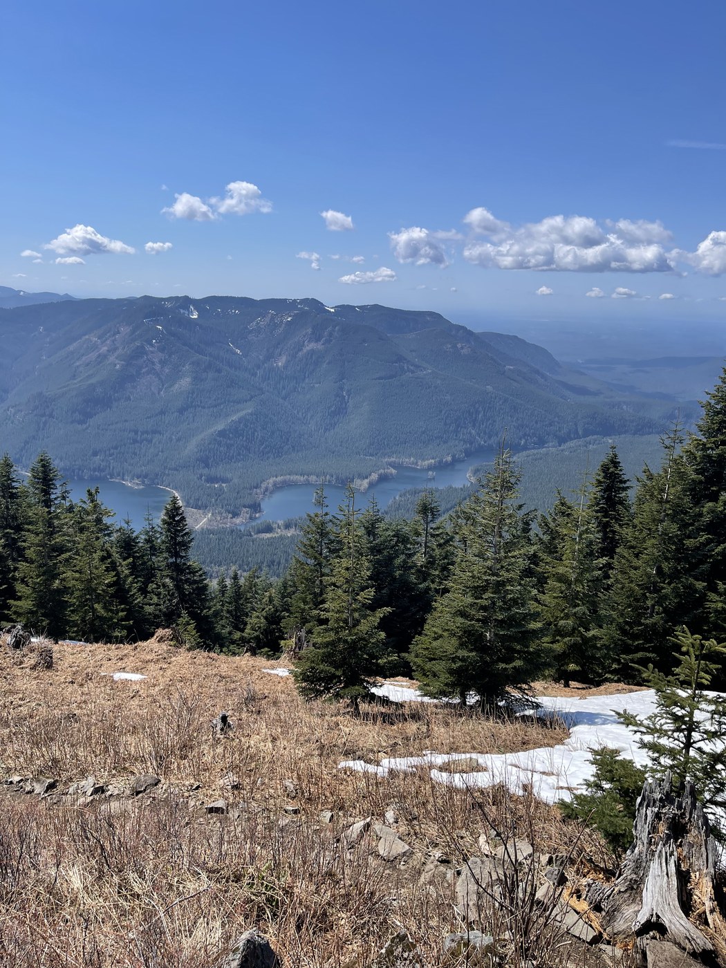This hike is a bit of an obstacle course, but the payoff is amazing. The first mile or so is super rocky and there are several other rocky parts to challenge your ankles and balance. There's water over the trail in a couple of places. And then there are some big snow patches starting at about 3400'. None of the snow patches last very long, just long enough to tempt you to put on spikes, and then there's more dirt and rocks following. I went all the way up and back with just poles and it worked out. The hike's only 9 miles, but it always feels like I've worked harder than that.