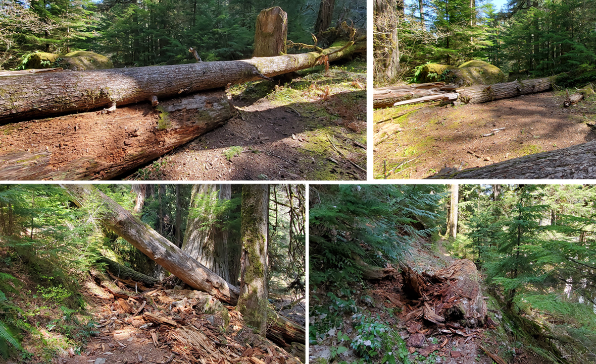 Wanting to get off the road as soon as I could, with the Ohanapecosh Campground and all associated trailheads also closed for construction, I took the short spur trail that’s about 0.4 miles up the road from the campground driveway. You’ll see a small parking area for ~8 cars on the west side of the road; the spur heads north from there. There are three large downed trees along this spur, two of which have fallen on each other and take some clambering to get over (other choice is to go under – see photo #2 below) but they are manageable.
