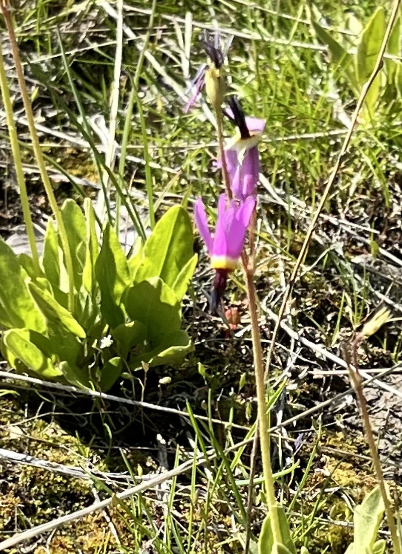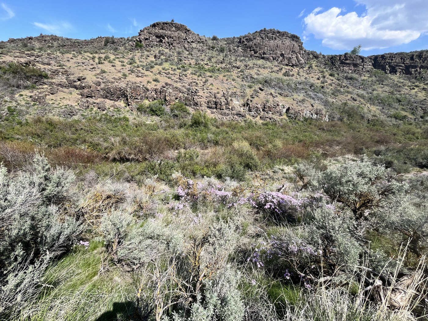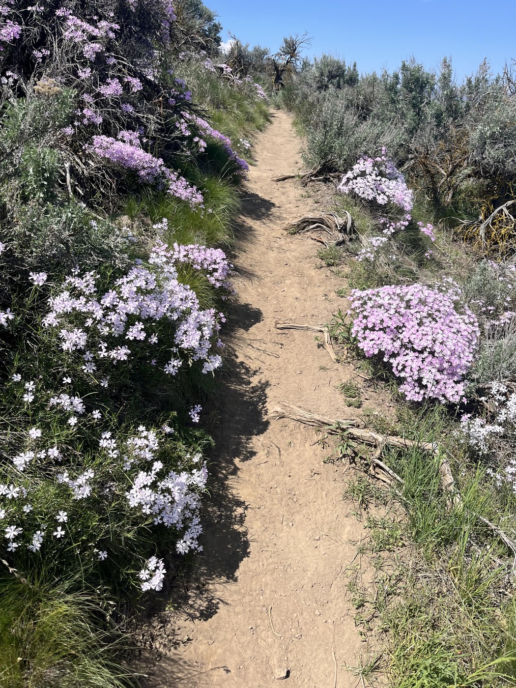 Phlox, phlox, and more phlox! Wildflowers are at their peak. There are a variety of trails to choose from at the preserve. Most people strolled along the wide trail that follows the river. We went up to the ridge along the Lone Peak trail and made a nice five mile loop with the Radio Flyer trail. We only saw three other hikers and a few bicyclists. The sage smelled lovely. We enjoyed the views of the farm houses and orchards on the neighboring hillside. Adams was also visible through the haze. The only downside for me was the lack of balsam root. There are a few scattered plants on the river trail, but not the flood of them you can find on other trails. It was a small price to pay to have the trail to ourselves while we delighted in all the other spring wildflower varieties.
