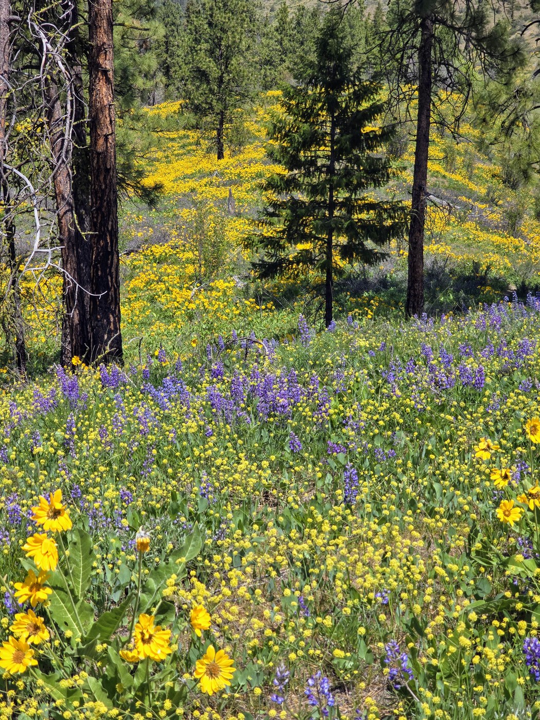 The balsamroot is starting to fade, but is still very, very thick. The volume of flowers brought big smiles to everyone on the trail. To the north of the trail leading up, you will find a little more lupine, barestem biscuit-root, and solitude (photo 3).