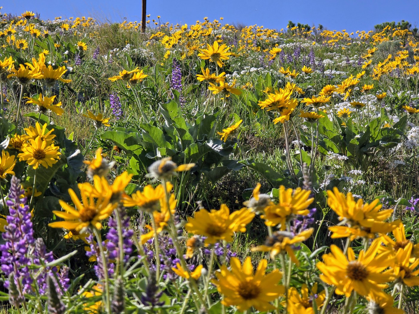 I've been coming here for 5 years, these aren't the thickest flowers I've seen here, but they are quite good. The balsamroot is fading in the low areas, but there are many thick areas (photo 1 is from the upper Homestead trail). These are all thick right now: lupine, showy phlox, larkspur, large-flower triteleia, and barestem desert parsley. Trails that had thick displays: Homestead (especially the upper half), Burt's, north facing portions of Sage Hills (photo 3), and the connector between the Horse Lake trailhead and the Homestead (photo 2). Showy phlox can be lovely (photo 4).