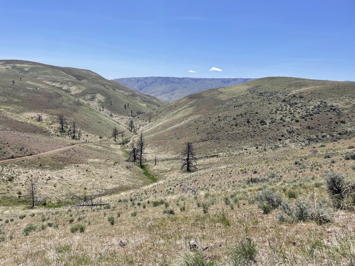 This wide open country is different from what I usually hike (I'm a wet-sider), but spring is the right time to go, so I went on a glorious day. I parked at the Elk gate, not knowing that it's fine to open the gate and drive to the berm. If you don't like driving gnarly roads, park at the sign. I could do with it with a non-high clearance vehicle, but it took skill, and the paint got more scratches. I hiked up to the Y junction, took the western road to the ridge, cut down to the eastern road, and back to the car. If there were more time, a good side trip would be up to 'Baby Head Hill' - maybe an extra hour- which looks like it had the best views.