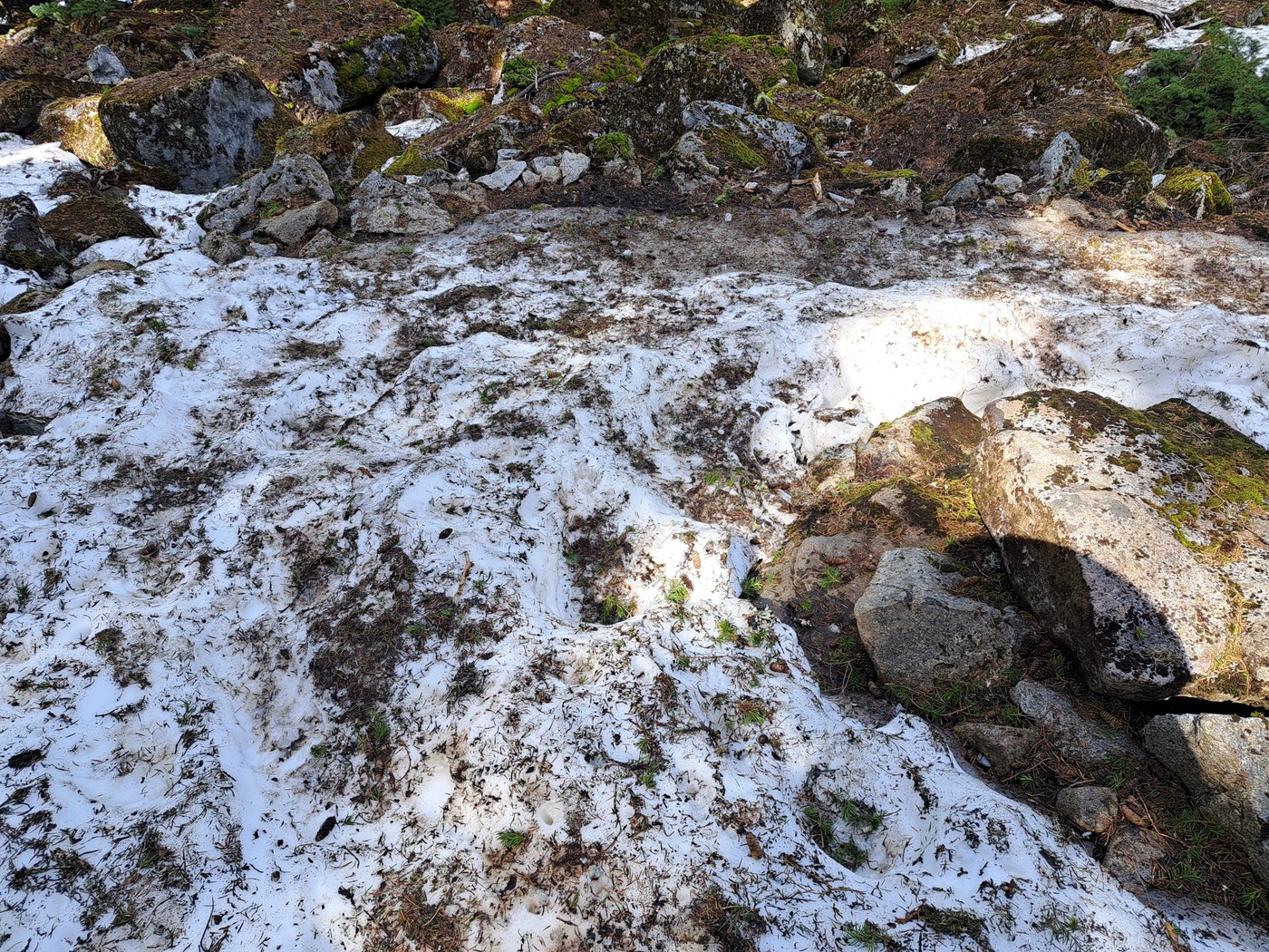 Trail Conditions: Intermittent snow starts @ ~4200'. Clear boot paths lead the way on packed snow. Plenty of dry sitting rocks near the lake. Campground is snow free.