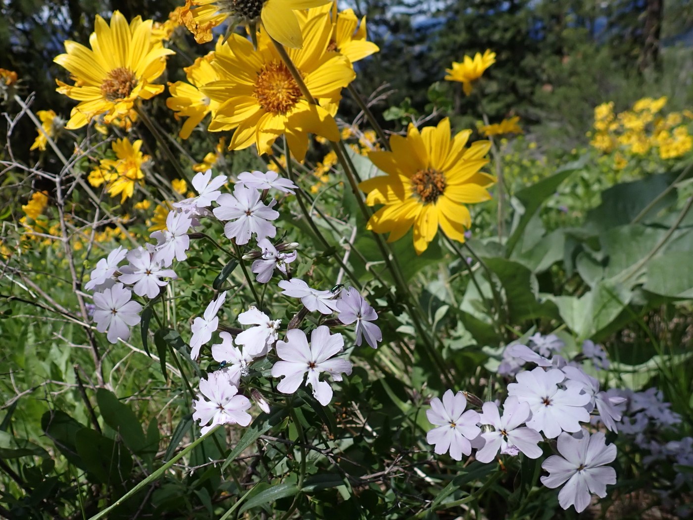 This hike is right at the top of my all time favorite spring hikes! So many flowers and nice views also. From the very beginning all the way to the top it is never boring. The limited parking keeps this one from being overrun, we left Everett at 6 AM and got there at 830 and we were the 4th car in the lot. The trail itself is brushy at the bottom and there are parts that are rough and uneven. There is sand on top of packed clay, which made the steep descent slippery and we had to be careful not to fall, but we're old. The younger hikers we saw had no problems with any of the trail. The balsamroot is beginning to go to seed on the first mile of the trail, but the upper 2 miles had meadows of yellow. Lupines are in full bloom, phlox is blooming, paintbrush is starting and many more small treasures to see. Lots of butterflies were enjoying the nectar too. Be sure to take a short walk past the sign at the top for more views and a beautiful clump of lavender penstemon. Our exciting wildlife siting was a pair of golden eagles circling overhead! I wasn't 100% sure until I got back to the car and double checked my bird book, because they are not often seen but this is part of their range. Loo was clean and stocked. Thank you to the Sauer family for the use of this beautiful trail! 6 miles, 2100 gain, reminded me that I just had a birthday!