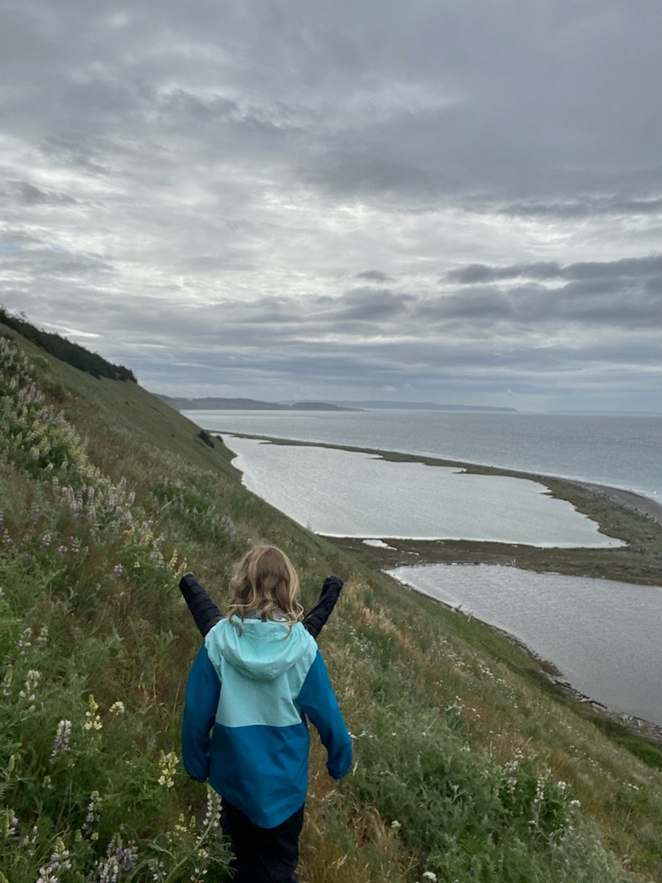 We hiked up to the bluff and then took the trail that goes along the ponds on the way back before crossing over to the beach. We have never been on this the pond trail before and it was so nice! Lots and lots of flowers! Pinks, purples, yellows galore! The flowers are most abundant near the end of the bluffs by the switchbacks. We were here almost a month ago and had seen maybe half the amount of flowers as this time. When the sun comes out next week, I think the flowers will really be popping! Also, lots of birds today. We had two eagles fly right over us. Lots of sparrows around the pond. There were also gulls, robins, red winged black birds and killdeer.