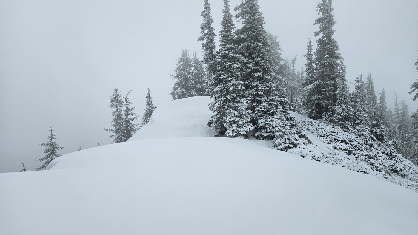 About this altitude the light sprinkles turned to occasional snow which put a lovely new layer of white on everything. The snow up the chute was a mixture of wind crusted granular icy stuff and loose snow. I kicked in steps for my partner and up we went. The saddle was heavily corniced so no peaking over the edge. We sat and had lunch with no view at all, except for the marmot that came out of his house in the rocks of Eagle Peak. We hung out for about 30 minutes and headed down without incident. Saw a few casual hikers on our way down that were turning around when they hit the snow. The sun was shining when we arrived back at Longmire, perfectly matching our moods.