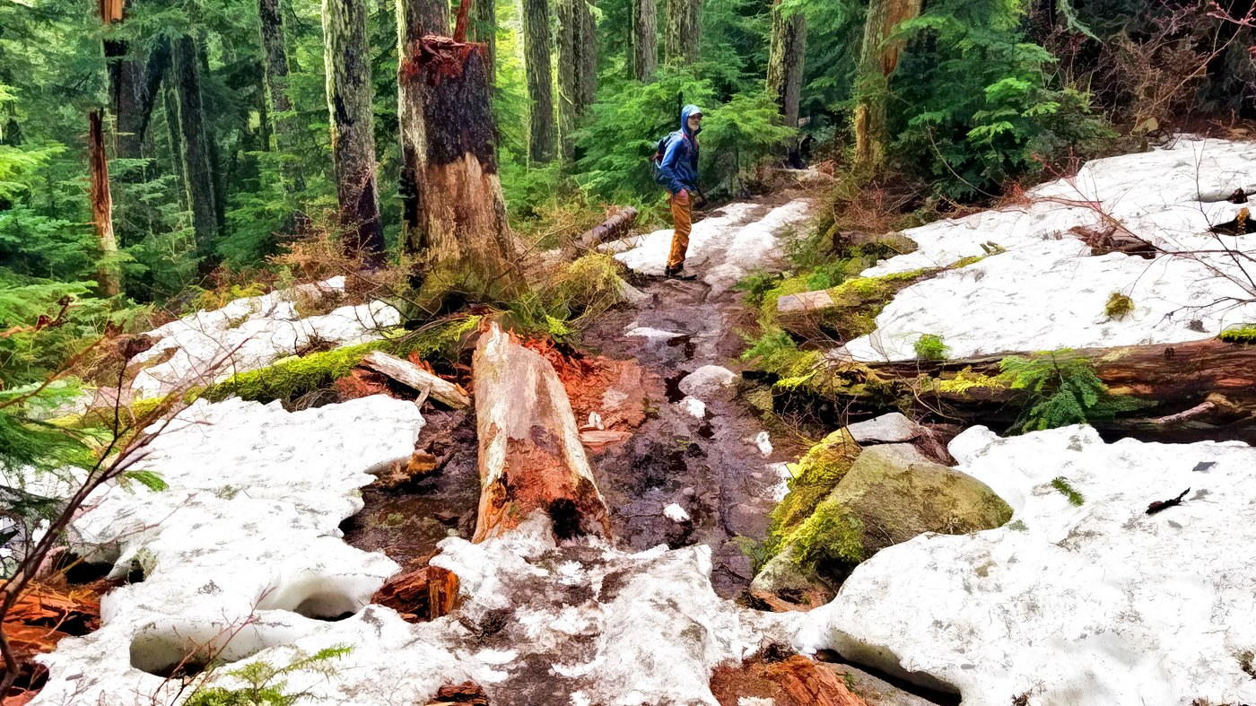 We traversed left and hiked up to the high point before the rocky descent to the lake. The temperature dropped as we approached the lake. We soon encountered scattered snowfields beside and on the trail, punctuated with muddy sections. The snow was soft and undercut, so we cautiously avoided punching through. Once at the lake, we stopped for lunch at the lake outlet. We chose an exposed spot, ready to take advantage of any warming sunlight that might appear. We layered up and broke out snacks. A hungry Gray Jay made an appearance, but the sun did not. We sat in that bowl of cold, near the mostly snow-covered lake, and made the best of it. We were alone.
