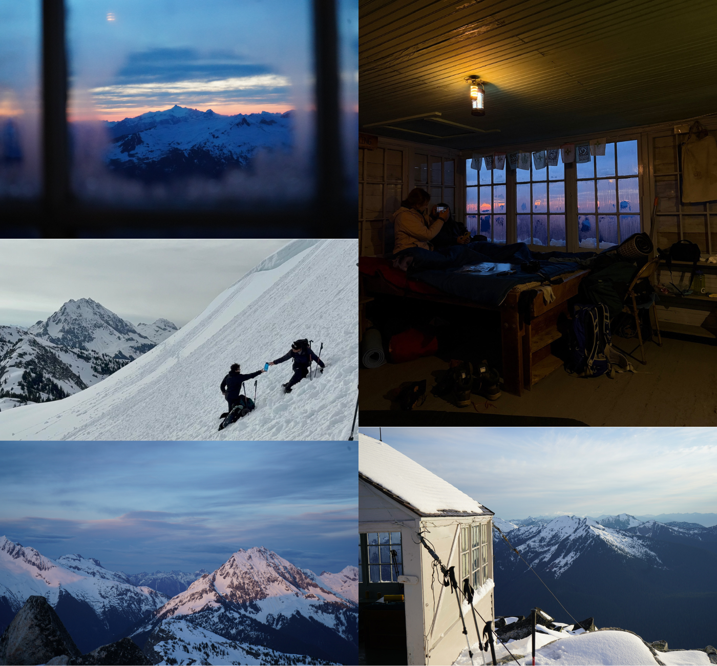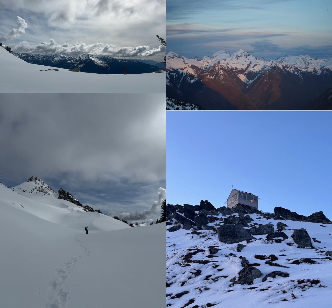 The next morning, we woke up at an early 5:00 am in hopes of a sunrise but were instead greeted with the cold reality of clouds and ice. To all of our protests, we reluctantly got out of bed and began packing everything up, putting on our still wet boots/socks, and tidying up the lookout before heading out at around 7:00. We then finally began our descent with hopes of an easier journey than our previous one hiking up. Unfortunately, the ice near the top and slush in the bowl made the first part of this descent very difficult and it took us nearly an hour and a half to make it back to the saddle. From there on, however, it was smooth sailing with early morning snow conditions that made it pleasantly easy to traverse with our snowshoes. Everything seemed to be going well. It wasn’t until we began glissading down the mountain here and there that tragedy struck, and I foolishly and unknowingly lost my phone coming down. This mistake cost us another hour of me backtracking to search for my phone to no avail (so if anyone happens to hike this soon and finds my phone please let me know!). However, once we decided to move on, we continued down without many obstacles, glissading down some of the steeper parts, and finally getting back to our warm car around 12:30.