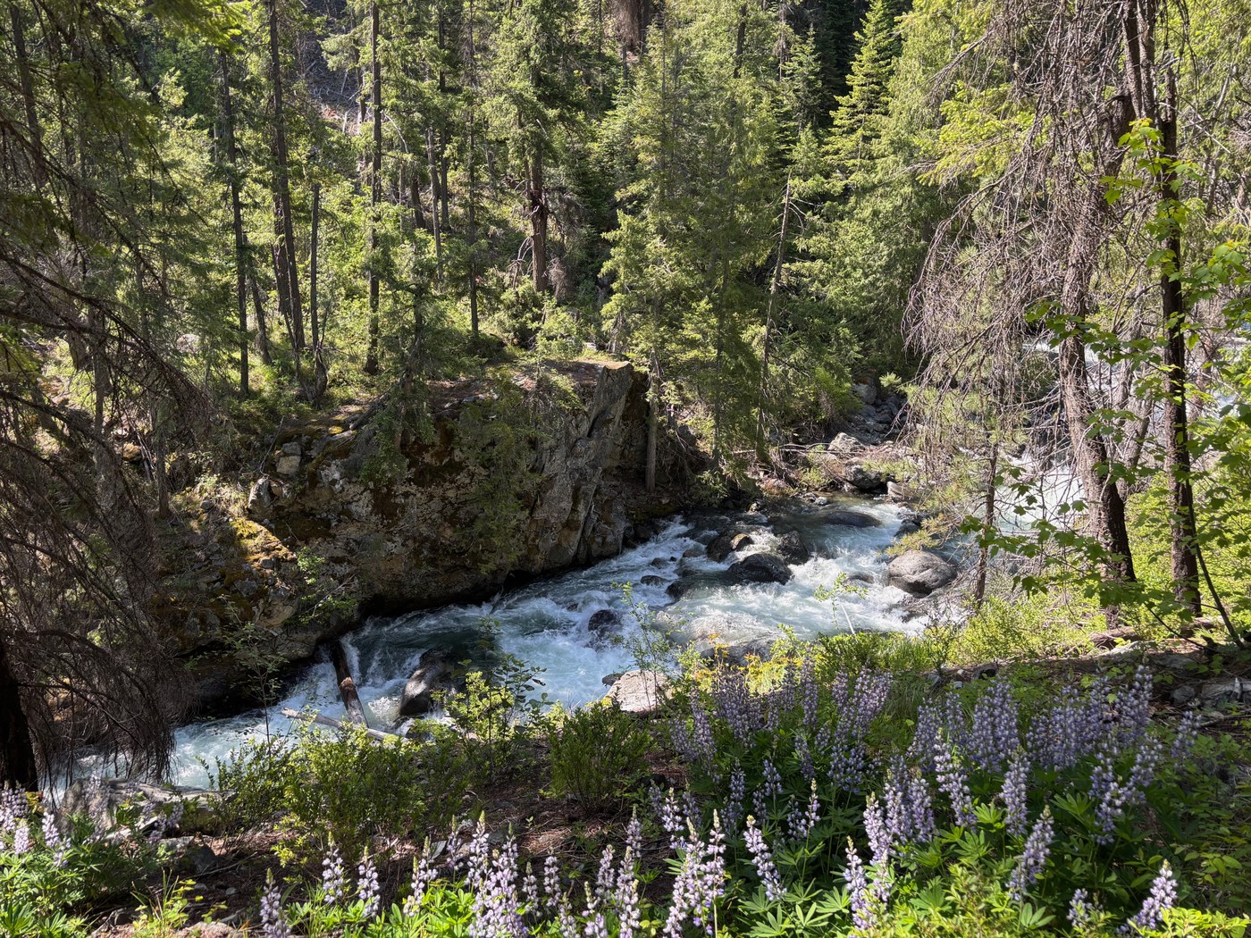 The trail was in good shape and saw a lot of folks going both directions with trail runners passing us every 15 minutes or so. Lots of flowers blooming and the constant roar of the creek. We saw a big group with dogs that had turned around after the 1st mile or so because there was a rattlesnake in the trail, which was a common occurrence, seemed like half the folks we talked to had seen a snake (more on that later). We didn’t see that snake so kept going. I was a little worried about finding a site as it was my daughter’s first overnight backpacking trip and was asking folks coming the other way about spots and got mixed feedback if we would find anything open within the first 5.5 miles. So, when we got to the camp a little over 2 miles into the trip which was had a large group, I panicked and we decided to hike back to the camp around 1.7 miles from the TH we saw was open when we initially passed it. So, we went back, setup camp and then hiked down the trail with lighter packs for a couple miles. I am guessing there must have been plenty of places to camp though as we were saw at least 10 - 12 other backpacking groups heading up the trail and we never saw them come back (camp was very close to the trail, so we could see most of the traffic). On our “day hike” we didn’t go too far because my daughter was toughing out a head cold and about 3.3 miles in we ran across our own rattlesnake (it rattled when it heard me coming, but stopped as soon as I did, then made its way across the trail largely ignoring us).